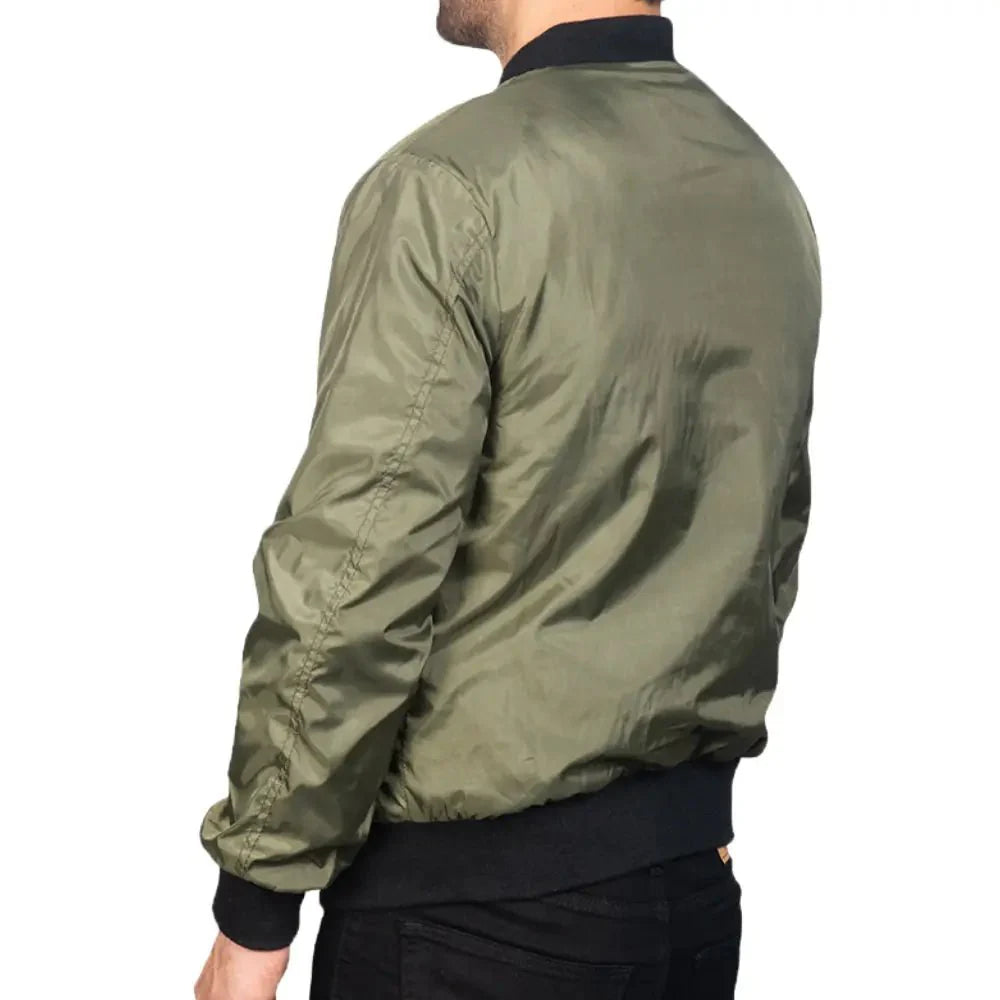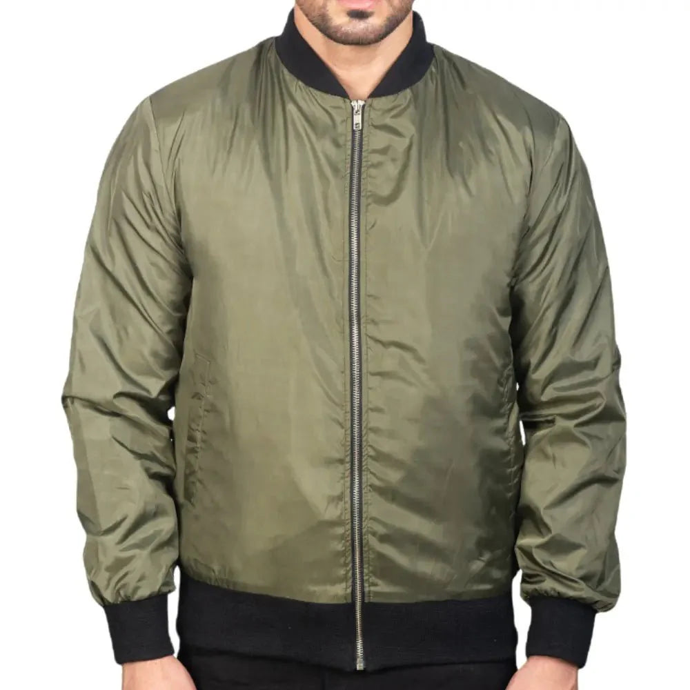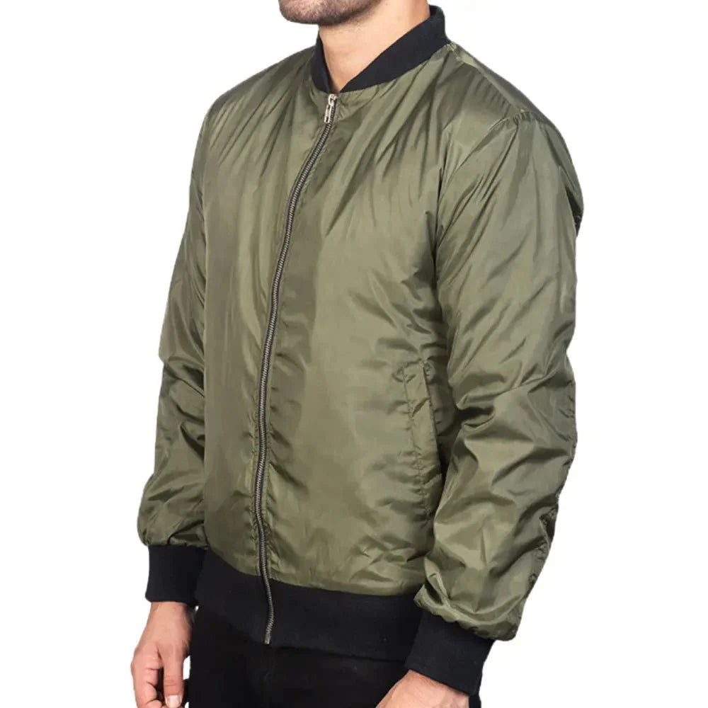 Sport a timeless look with the Rib Knitted Green Bomber Varsity Jacket. Made from durable nylon, this bomber jacket showcases a vibrant green color, a varsity-style collar, and a practical zipper closure. Rib-knit cuffs and ample pocket space—two outside and two inside—make it a versatile choice for any casual outfit.