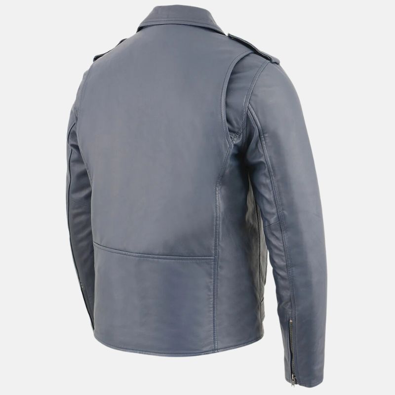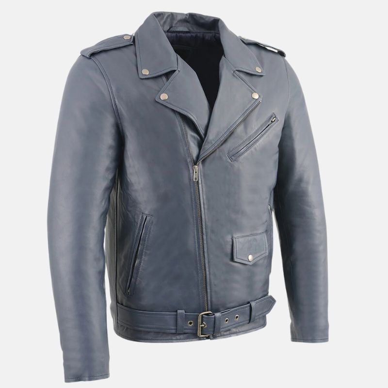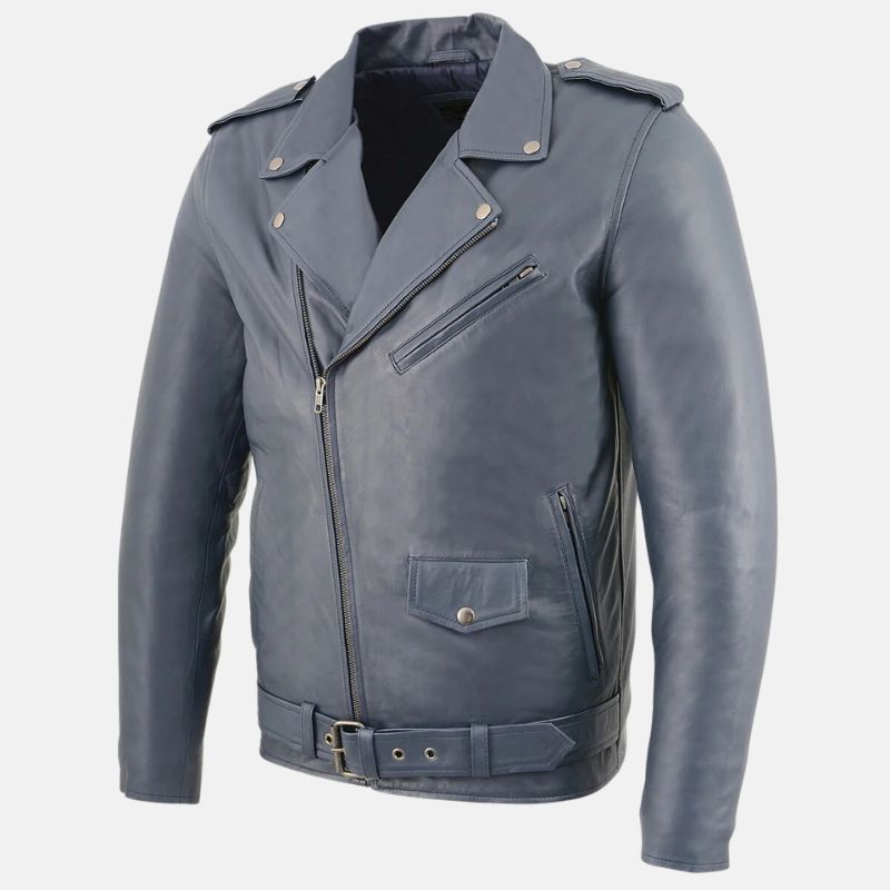 This asymmetrical biker blue leather jacket mens is a bold choice for any guy. It’s got a classic biker style with a modern twist and the asymmetrical zipper, and shoulder straps give it a cool, edgy look. This blue leather biker jacket mens is made from premium leather and it feels soft on the inside because of its viscose inner. With multiple zipper pockets, you can keep your stuff safe and handy.