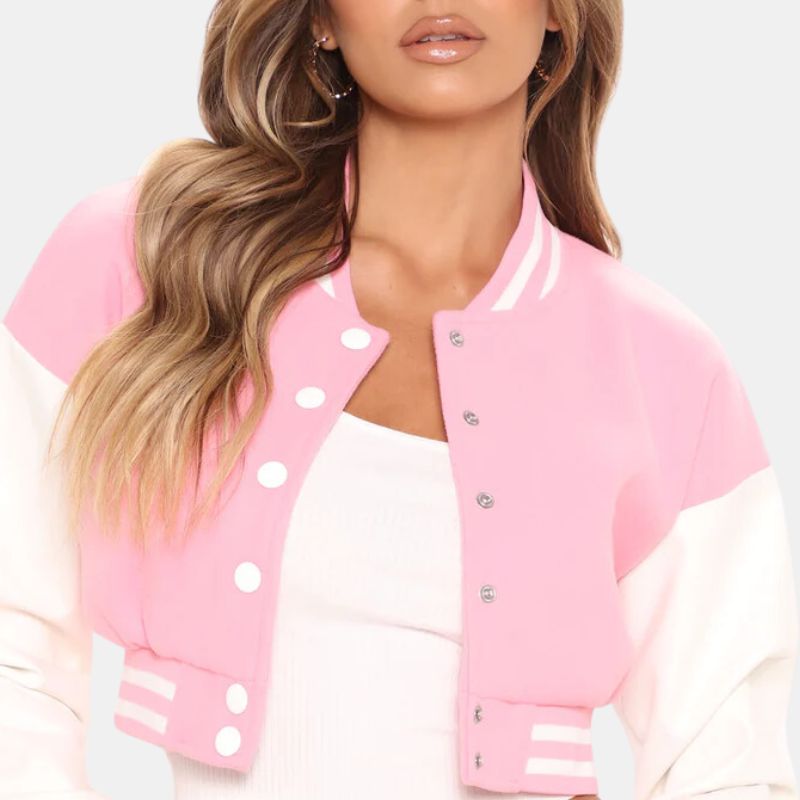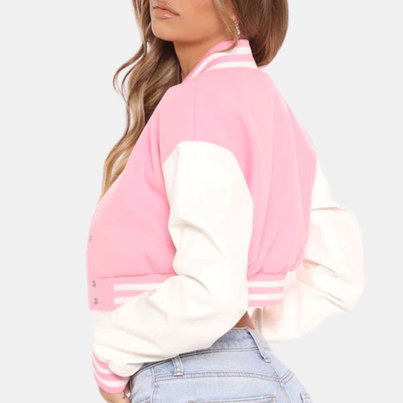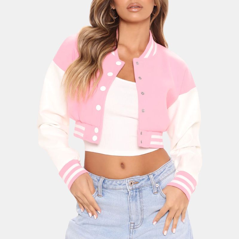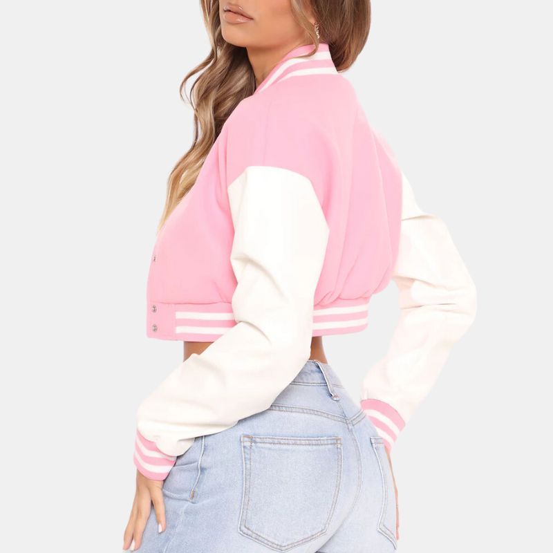 Pink Cropped Hot Topic Varsity Jacket With Leather Sleeves For Women
