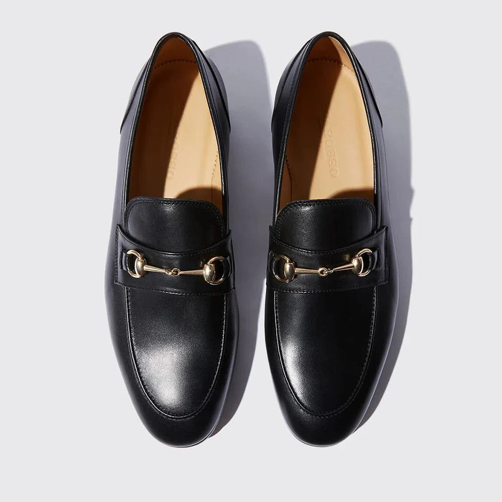 Step up your style with these elegant black leather horsebit loafers mens. Crafted from premium top grain leather, they offer a luxurious feel & durability. The inside is lined with full grain calf for ultimate comfort. Featuring a flexible rubber sole, these black leather loafers are designed for all day wear. The chic gold colored horsebit detail adds a touch of sophistication, making them perfect for both office settings & party occasions.