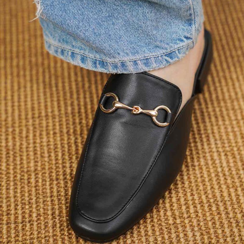 Black Leather Womens Slip On Loafers With Buckle