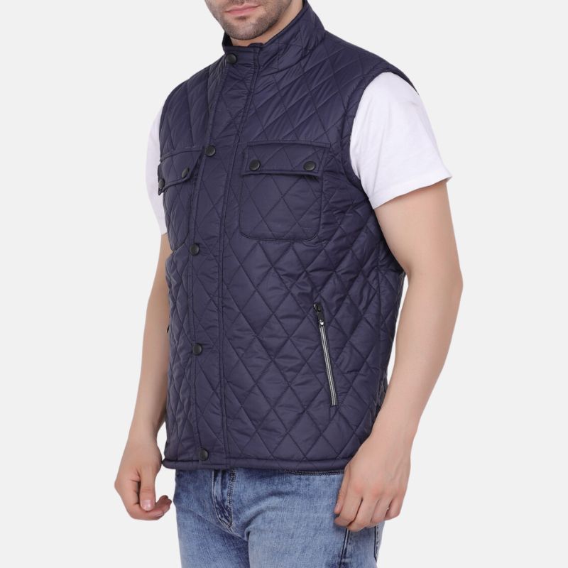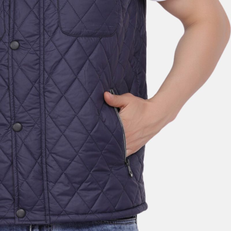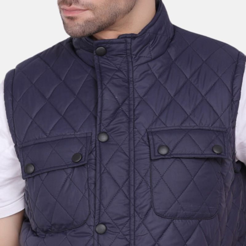 Don’t let unpredictable weather dictate your outfit. This men’s quilted sleeveless jacket is your secret weapon against the elements. The dark blue quilted design exudes timeless style, while the button and zip closure duo ensures a comfortable, secure fit. A functional funnel neck shields you from chills, and four pockets keep your belongings safe and sound. Ideal for outdoor adventures or everyday wear, this quilted men’s vest jacket is a must-have for any fashion-forward gent.