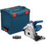 The Bosch GKT13-225 Track Saw with Plunge Action delivers precision and power, ideal for making table-saw quality cuts to wood and wood-based sheet goods such as laminated particle boards and plywood. The track-guidance system provides exact adjustments for precision end-to-end cuts and plunge cuts. The saw and track combination makes it a more easily transportable alternative to a table saw. The precision of the track saw and blade combine with the optional Bosch tracks (sold separately) to deliver a straight fast finish cuts. The saw is engineered to fit precisely to the tracks. The saw includes constant electronics to help maintain speed under load. The saw also features a spindle lock, a swiveling hose port and a lock-off mechanism. It features overload protection. It has a single pivot point for both bevel and non-bevel cuts, from -1° (for slight undercuts) to +47° cuts. It allows for efficient dust extraction when connected to a suitable vacuum cleaner. The GKT13-225L Kit includes a 48-tooth 6-1/2 In. track saw blade, blade-change wrench, and an L-Boxx case. Bosch offers a full range of optional attachments, including four different track lengths, connector for connecting multiple tracks, an angle guide and a rip fence.