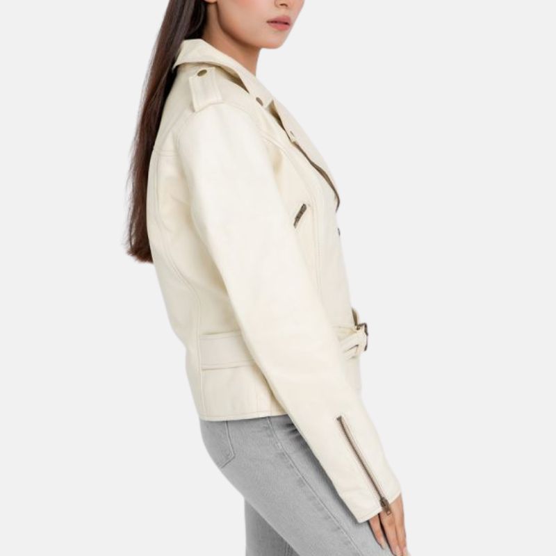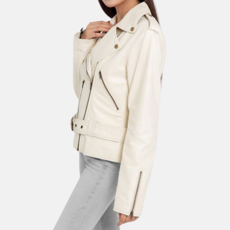 Embracing Versatility, Our Collection Now Caters To Ladies Who Appreciate Leather And Biker Jackets. In Tune With The Active Lifestyle Of Modern Women, We Present This Tailored White Leather Jacket. Designed With Precision, It Rests Above The Waist, Boasting A Chic Coat-style Collar Adorned With Stud Accents. The Diagonal Zip Adds Flair While Vertical Side Pockets Enhance Functionality. Full Sleeves Come With Front Zips, And A Stylish Stitching Pattern Graces The Back. This Versatile Piece Pairs Seamlessly With Any Pants, Promising Comfort For Indoor Or Outdoor Pursuits. Exceptionally Priced, This Wardrobe Essential Awaits Inclusion In Every Woman’s Closet.