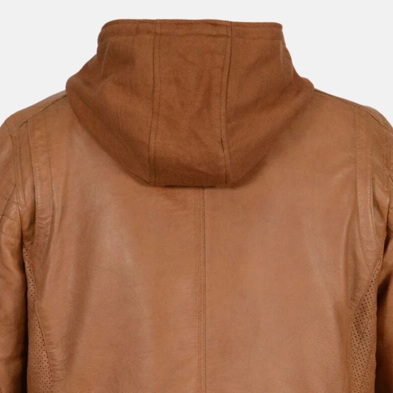 This brown biker mens leather jacket with hood is perfect for any weather. It’s got a classic biker style with a removable hood and snap tab collar. Made from premium leather which looks tough and it feels soft inside because of its soft viscose inner lining. This mens biker leather jacket has lots of pockets to keep your stuff safe and a zippered front for a secure fit.