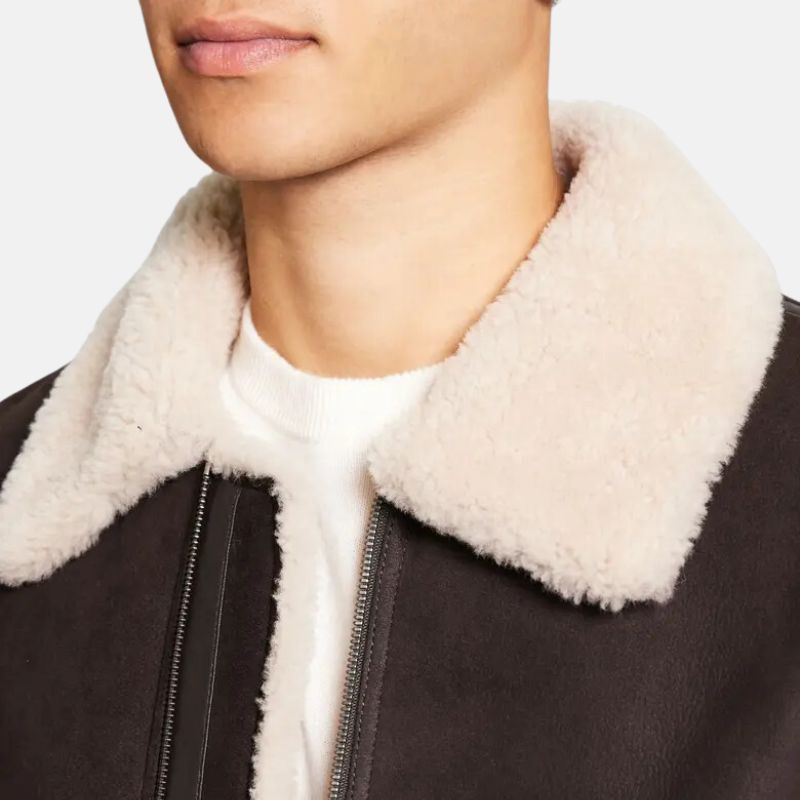 This brown leather shearling bomber jacket mens is built for both comfort and style. The exterior is made from 100% premium leather which gives it a classic look that only gets better with age. Inside, a soft shearling lining keeps you toasty warm. This brown bomber lether jacket features a traditional bomber design with a fur collar for a touch of luxury, along with ribbed knit cuffs and hemline for a snug fit that keeps the cold out. Two zippered pockets on the outside and one inside offer secure storage for your essentials.