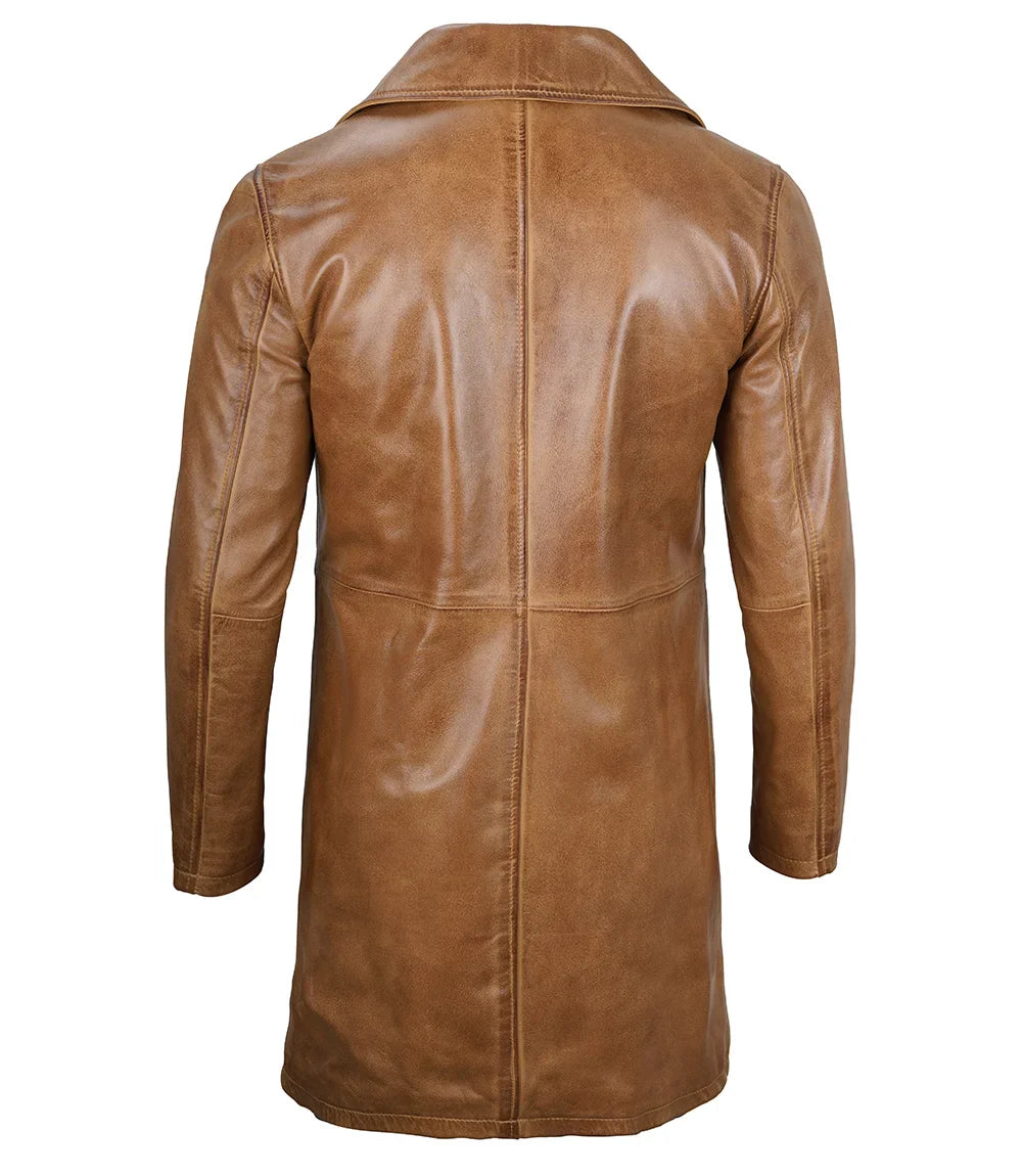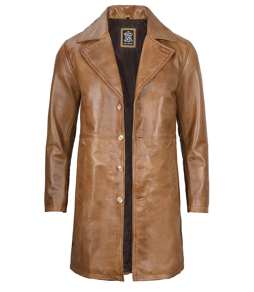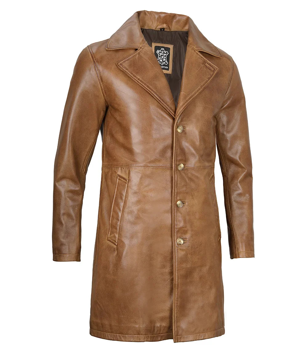 Stay warm and stylish in the Bryson Mens Camel Brown Leather Car Coat. This coat will last for years. Its classic camel brown color adds a touch of sophistication to any outfit. Perfect for any occasion, this coat is a must-have for any fashion-forward individual.