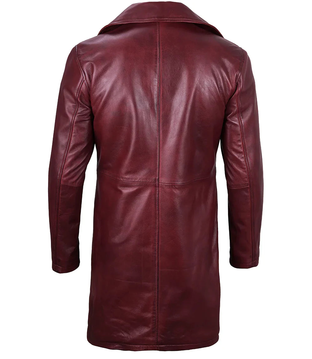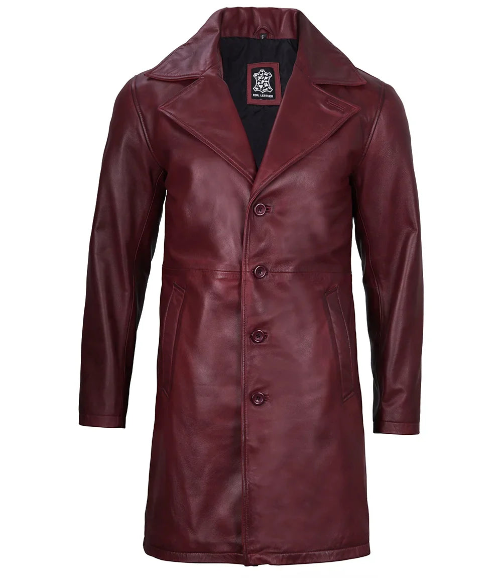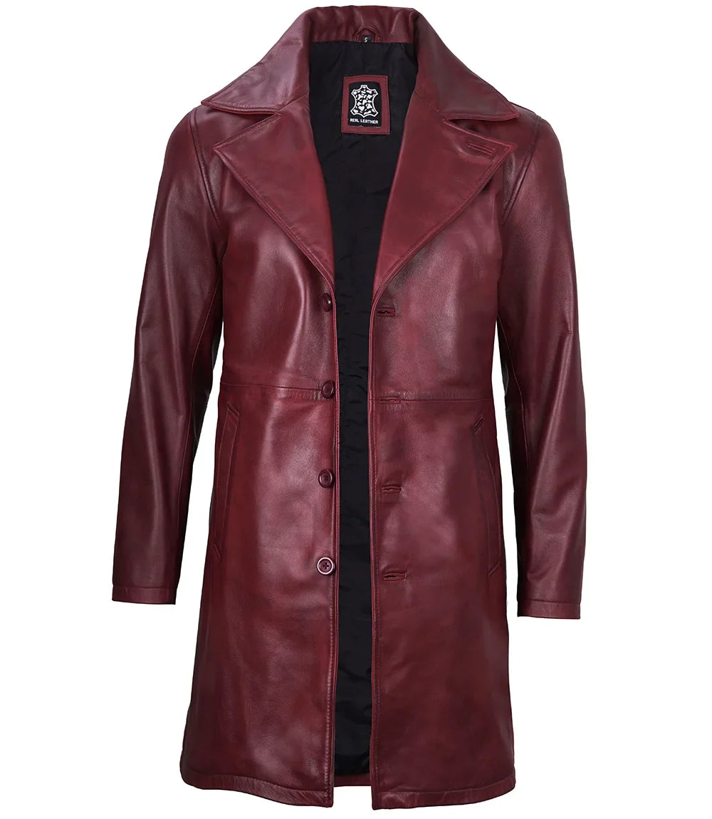 Stay stylish and warm this winter with our Bryson Mens Maroon Leather Car Coat. Made with high-quality leather, this coat not only adds a touch of sophistication to your wardrobe, but also provides excellent insulation against the cold. Perfect for any occasion, from a night out to a morning commute.