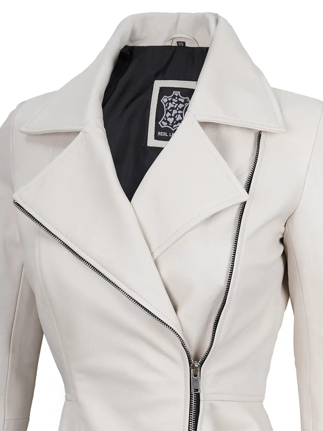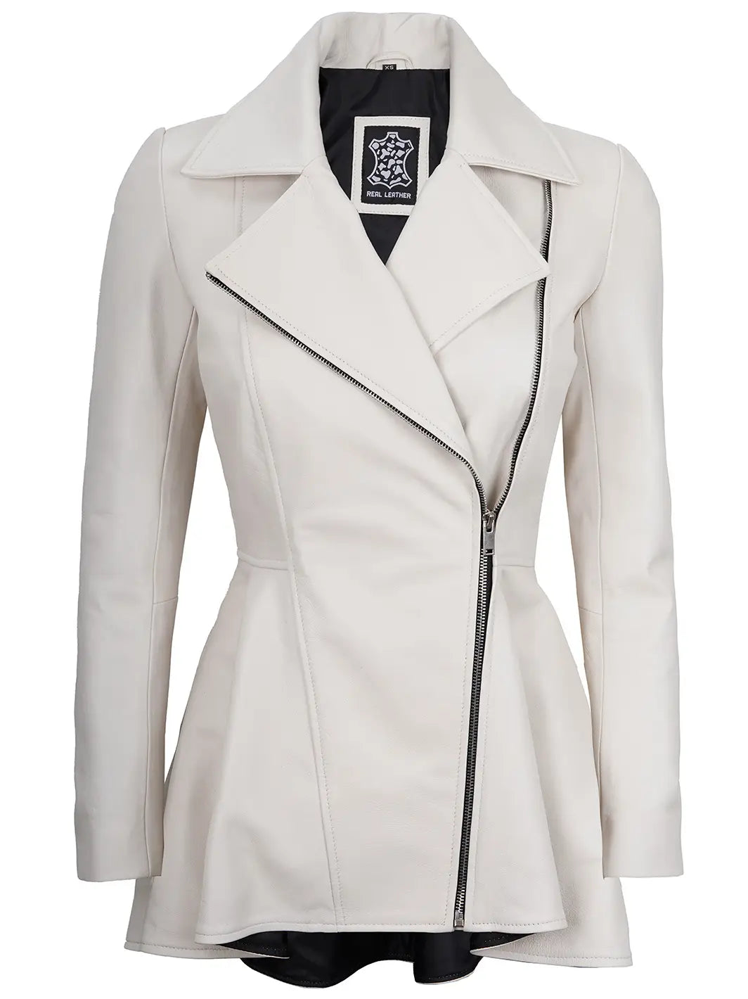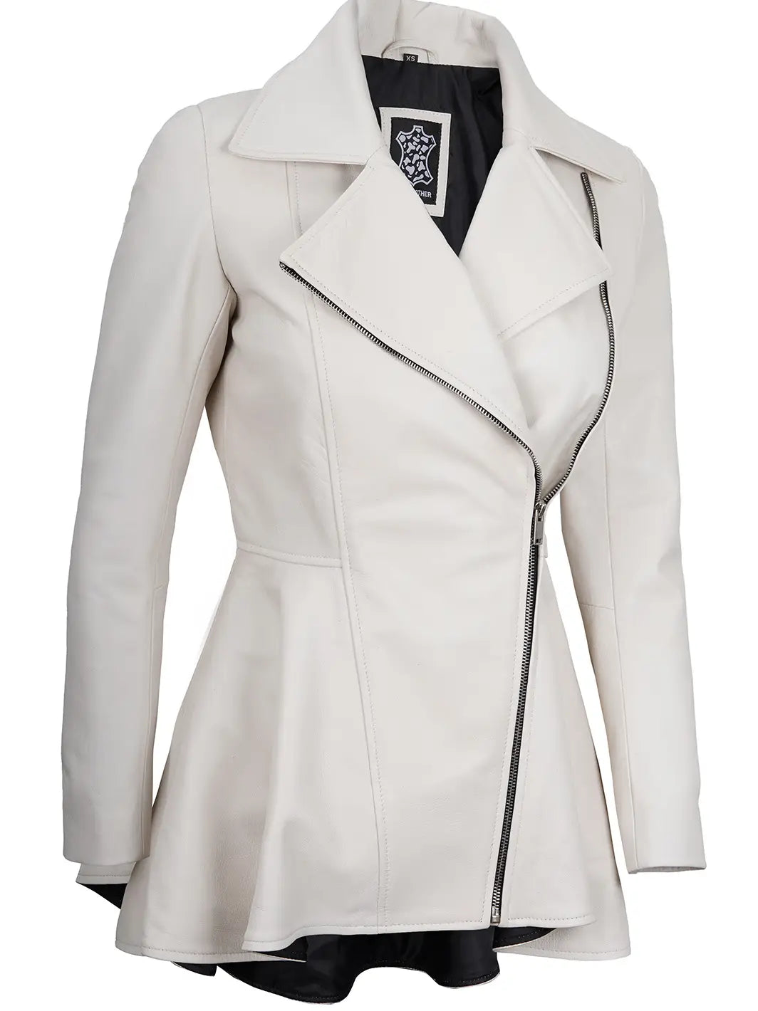 Meet the Clarissa Off White Asymmetrical Peplum Leather Jacket: a bold fusion of elegance and edge. Crafted in chic off-white leather, it boasts an asymmetrical zipper and stylish peplum waist detail, perfect for making a statement wherever you go.