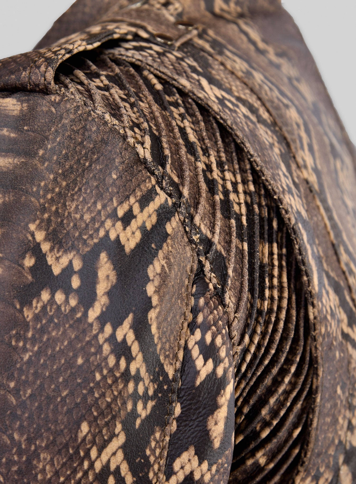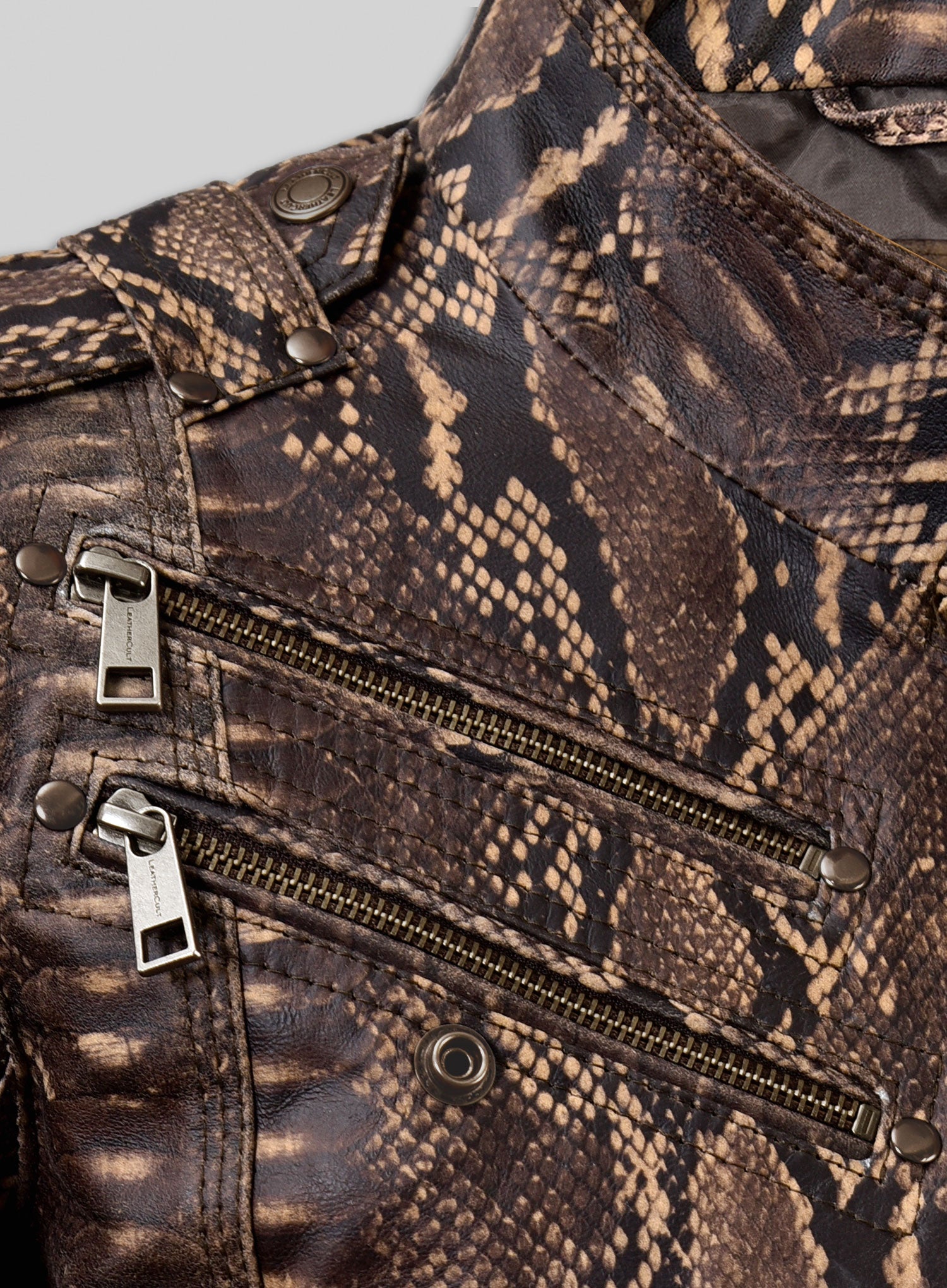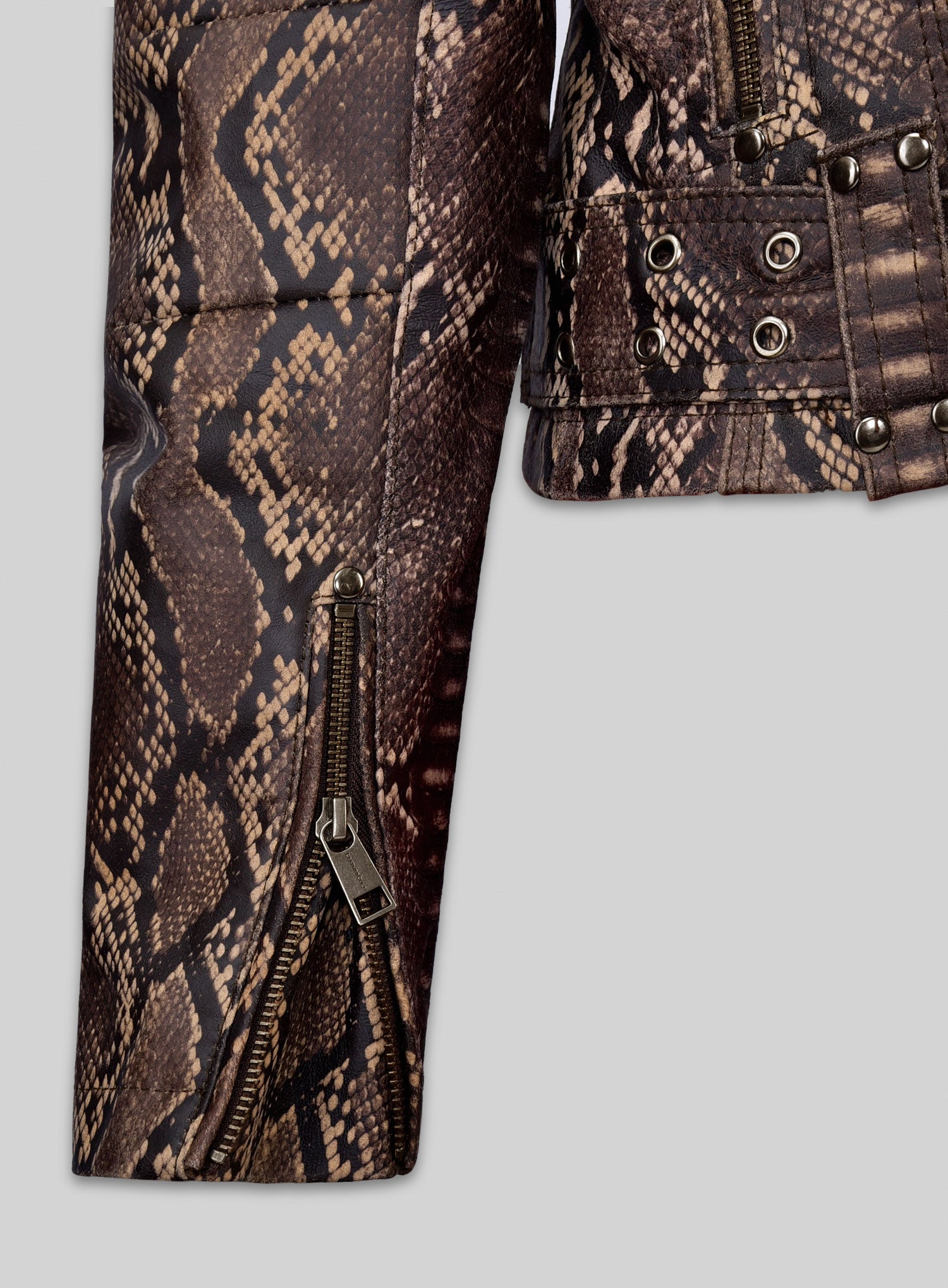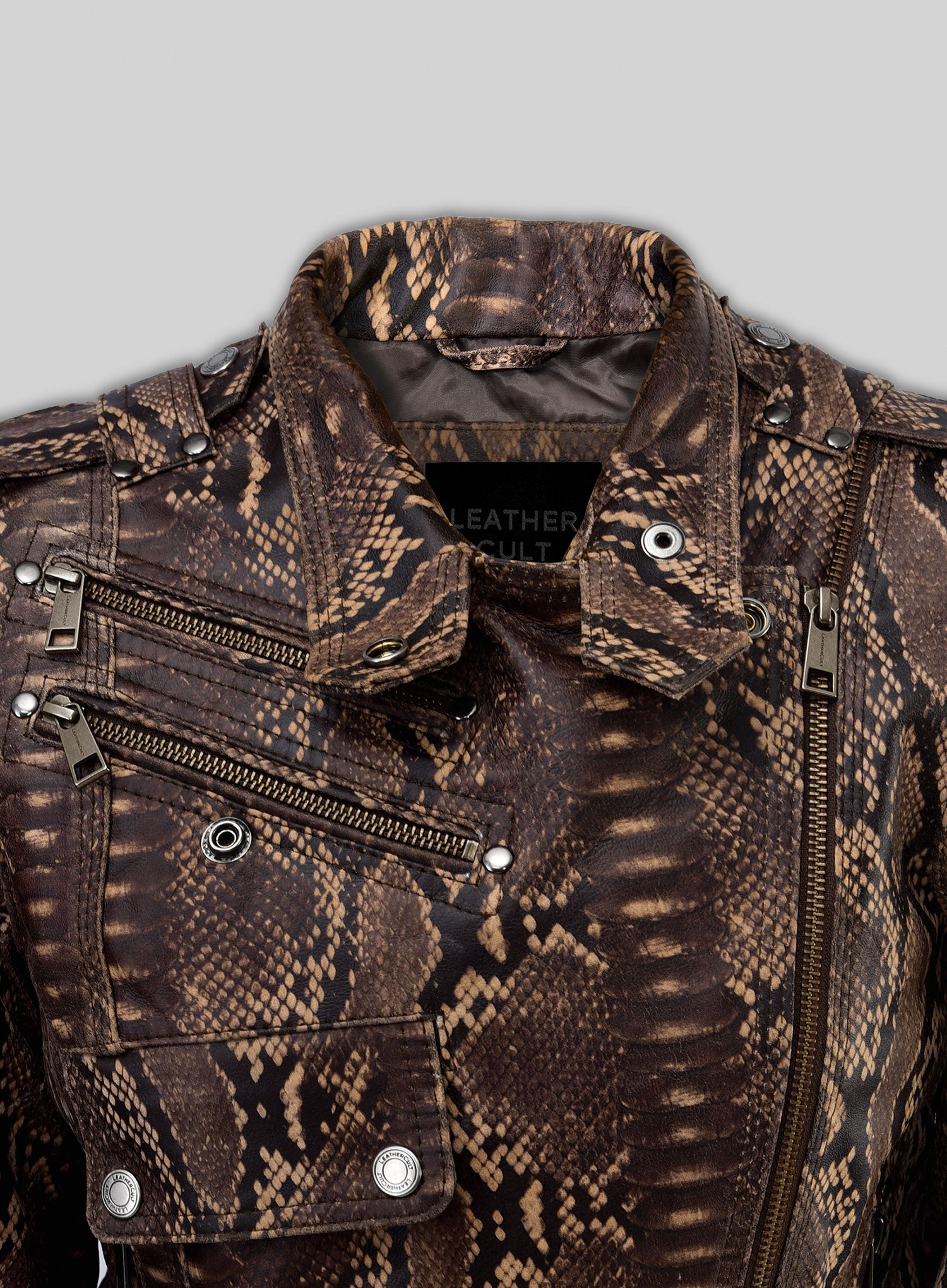 Add a chic factor to your attire with our Dark Brown Python Leather Jacket # 280 that will effectively make you stand out flawlessly. Its unique and stylish snakeskin texture will always help you gain admiration from others and positively showcase your upbeat character.