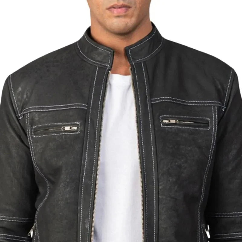 This cool Black Biker Distressed Leather Jacket Men’s with a vintage, worn-in look is crafted from 100% premium leather and it features a soft viscose lining for extra comfort. Inspired by the classic biker style, it has a stand up collar and snap button cuffs. The front zipper closure makes it easy to put on and take off and it has four outer zipper pockets and one inside pocket.