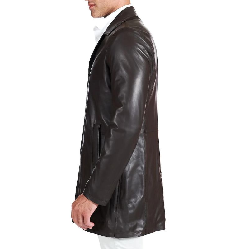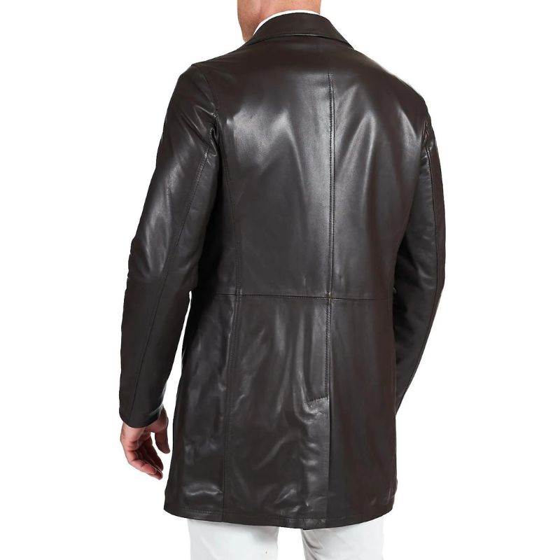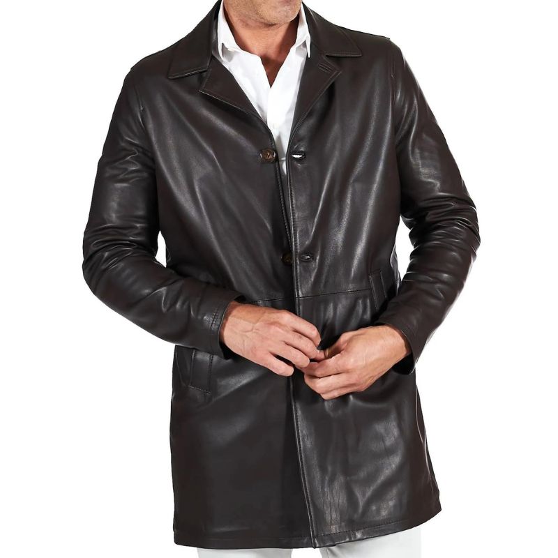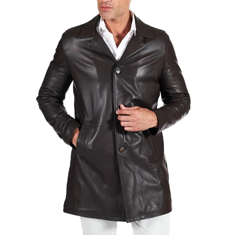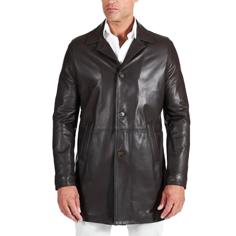 This men’s lambskin distressed brown leather coat is crafted from premium lambskin leather in a handsome distressed brown finish. The soft viscose lining adds extra comfort for all day wear. This leather car coat hits at a flattering quarter length and features a wide shirt style collar. The clean finished open hem cuffs and button front closure add a polished look and it has two side pockets and one inner pocket.