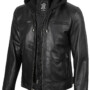 Men’s Black Biker Style Leather Jacket with Removable Hood