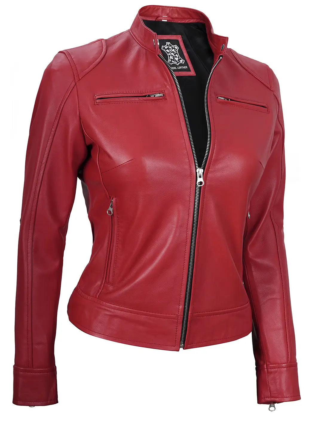 Gear up in style with the Womens Red Cafe Racer Leather Jacket. Crafted from high-quality red leather, it blends classic biker aesthetics with modern comfort for a versatile look on and off the road.