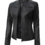 Designed for petite women, its deep black hue exudes a bold and edgy demeanor, making it a versatile choice for various occasions. Whether you’re embarking on an exhilarating journey down open roads or immersing yourself in the bustling urban atmosphere, the Dodge Black Lambskin Leather Moto Jacket is your ultimate choice for those with petite frames.