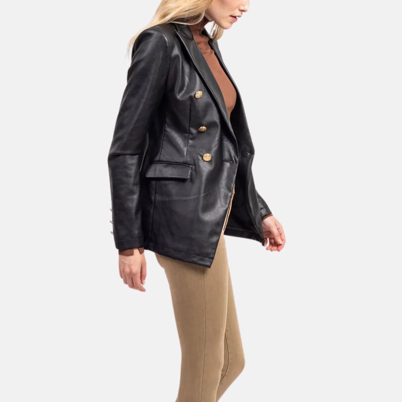 Indulge in timeless elegance with our Women’s Black Double Breasted Leather Coat. This classic double breasted beauty, in striking black, exudes the style. Its straight collar & front double-press style provide a unique, chic touch, while the front zip closure & two side pockets with flaps offer both functionality & flair. For that extra edge, it features zips on the cuffs. Not just a fashion statement, this jacket is as practical as it is stylish. Its sleek design enhances the beauty of the female body, & the versatile black color effortlessly complements any pair of pants. Whether you’re hitting the town or hitting the road, this leather jacket is your durable & long-lasting companion, making it a must-have addition to your wardrobe.