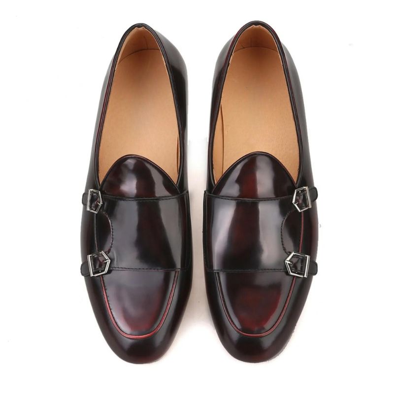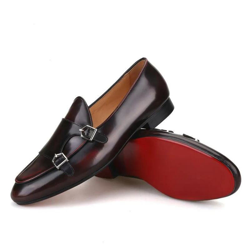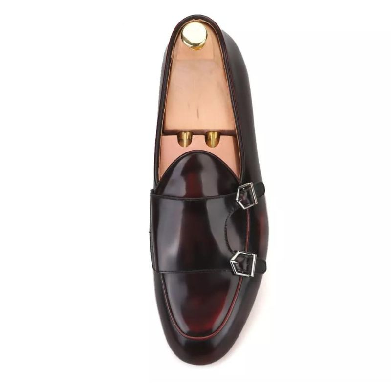 Introducing a stylish pair of burgundy leather loafers for men featuring double monk straps. Crafted from premium full grain leather with a flexible rubber sole, these loafers are both classy & comfortable. The fully lined supple glove leather interior ensures a luxurious feel with every step. With a buckle closure & handcrafted detailing, these loafers are perfect for transitioning between formal & casual settings effortlessly. Whether for work or leisure, these shoes offer versatility & timeless elegance for any occasion.