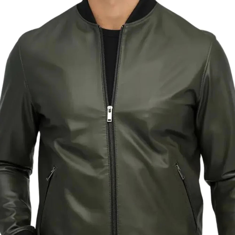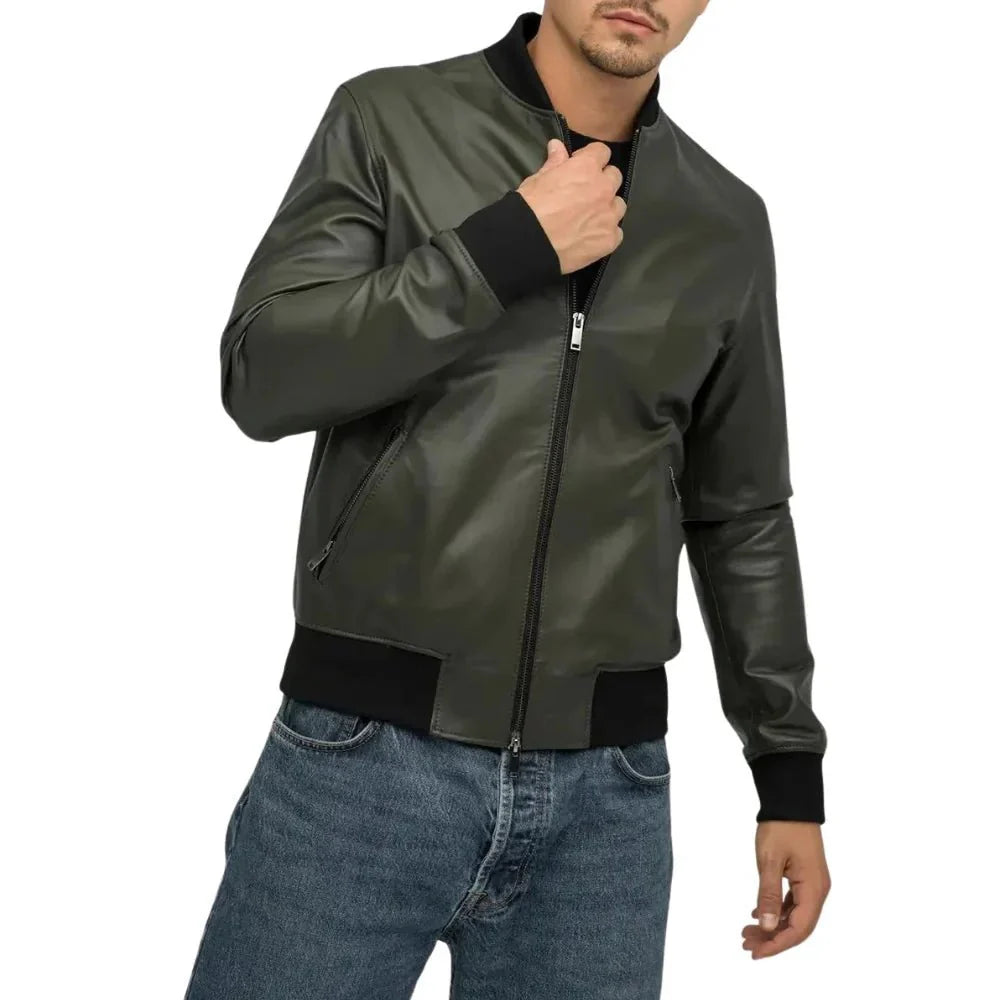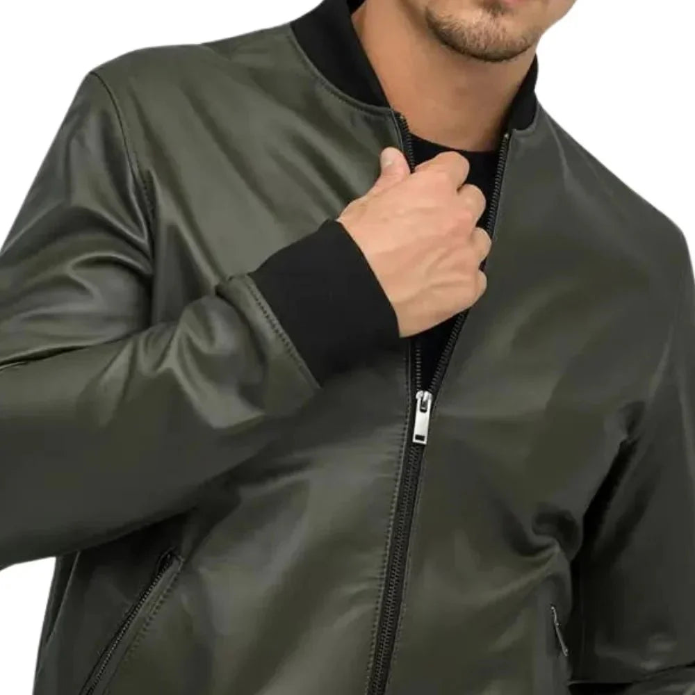 This green lambskin bomber leather jacket mens is made from premium lambskin leather and the inside is lined with viscose for added breathability, making it perfect for year round wear. This mens green leather jacket features a classic bomber design with a ribbed collar, cuffs for a snug fit, a front zipper closure for easy on and off, and two zippered pockets at the side and an extra pocket inside for valuables.