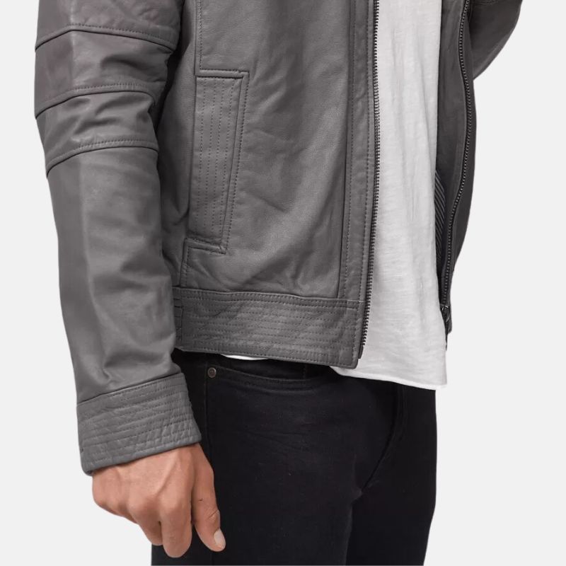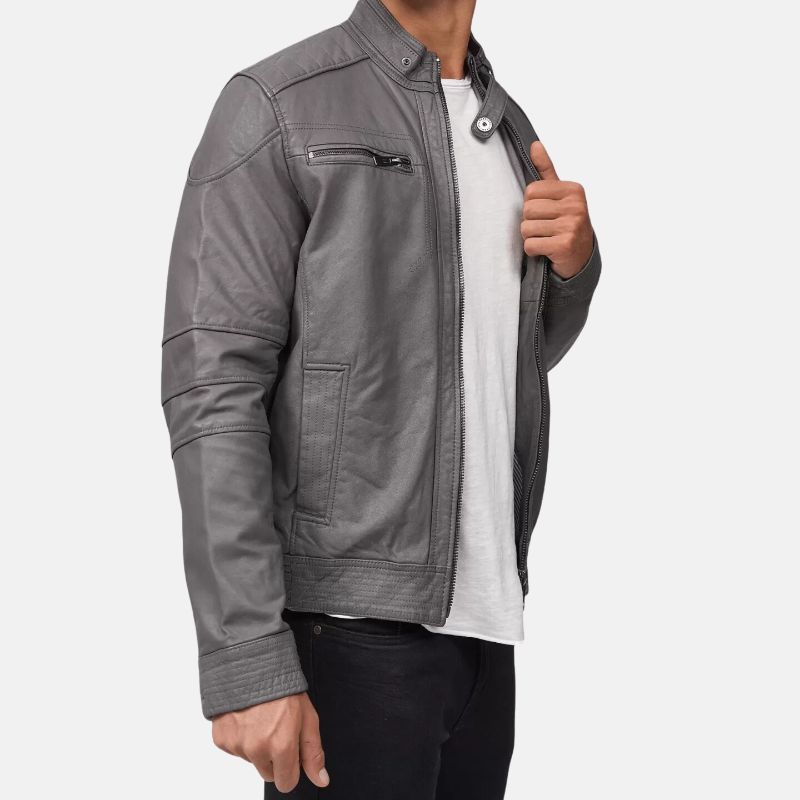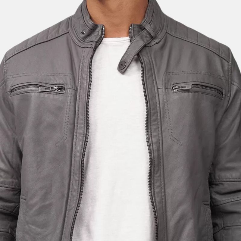 This grey cafe racer leather jacket mens captures the essence of the classic cafe racer style. It’s made from 100% premium leather and the soft viscose lining keeps you comfortable on your long rides. This grey biker jacket features a snap tab collar for a vintage vibe and a zippered front closure for easy on and off. The quilted shoulders add a touch of style and provide some extra warmth.