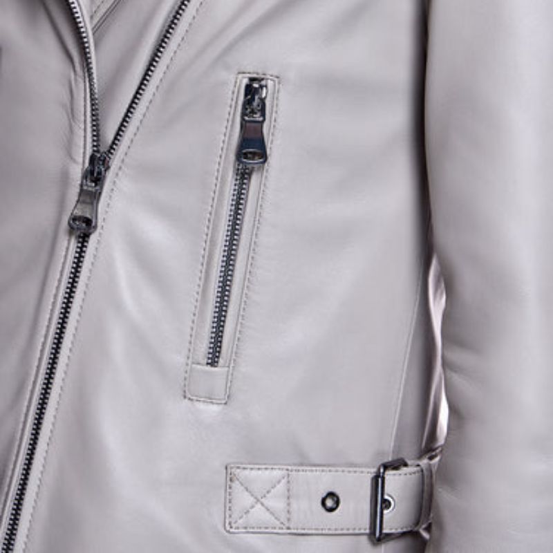 This grey leather womens biker jacket might be perfect for you. It’s made from 100% premium leather which gives it a cool and worn in look. On the inside, a viscose lining keeps you comfortable all day long. This grey leather biker jacket womens features a classic biker silhouette with an asymmetrical zipper closure with open hem cuffs and a lapel collar.