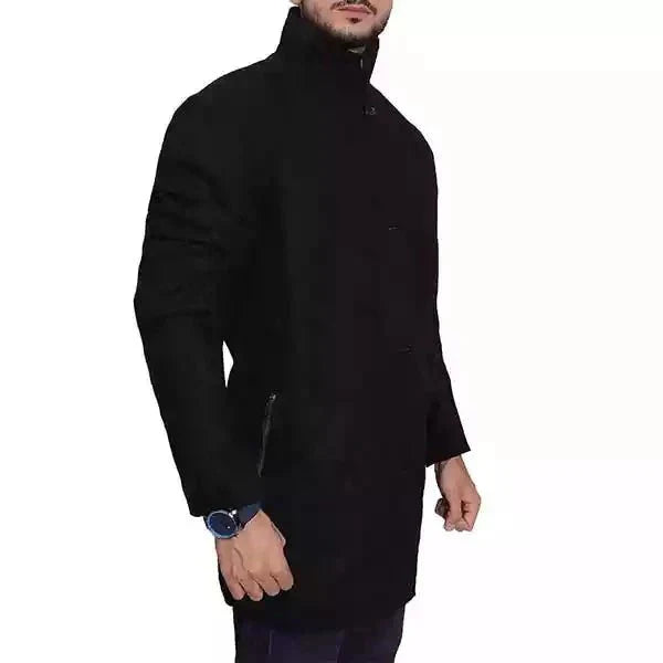 Elevate your fashion game with the exquisite Howard Counter Black Coat, inspired by American elegance. Crafted from premium wool, it offers warmth and comfort with a touch of luxury. Featuring a stand-up collar, front button closure, and practical pockets, this coat ensures both style and functionality. Its full sleeves with open cuffs provide an ideal fit. The timeless black color effortlessly complements any outfit. Whether you seek to impress or invest in quality outerwear, this coat is the perfect choice. Pair it with shirts or pants for a formal look, or mix and match with tops and casual bottoms for versatile style. Elevate your wardrobe today.