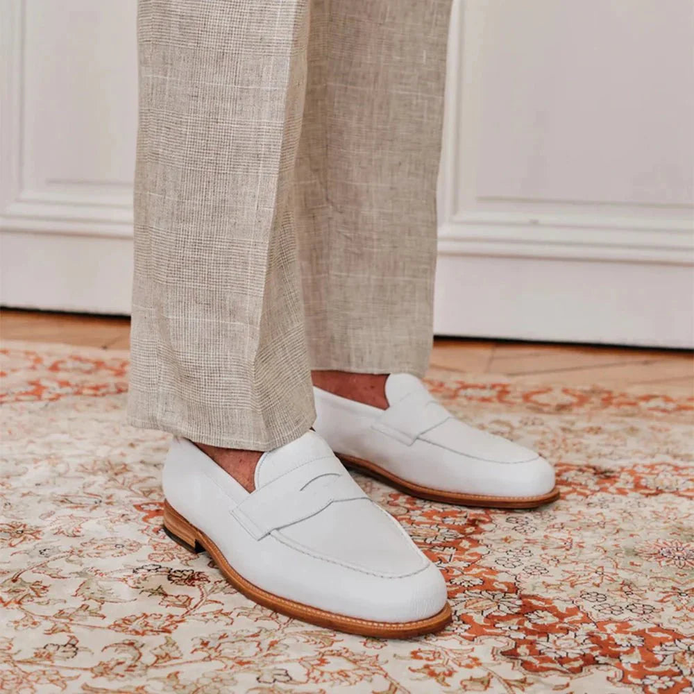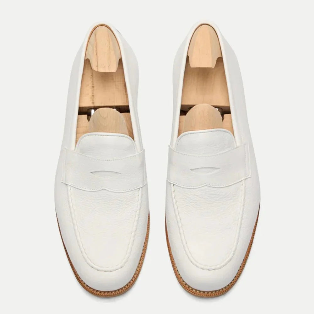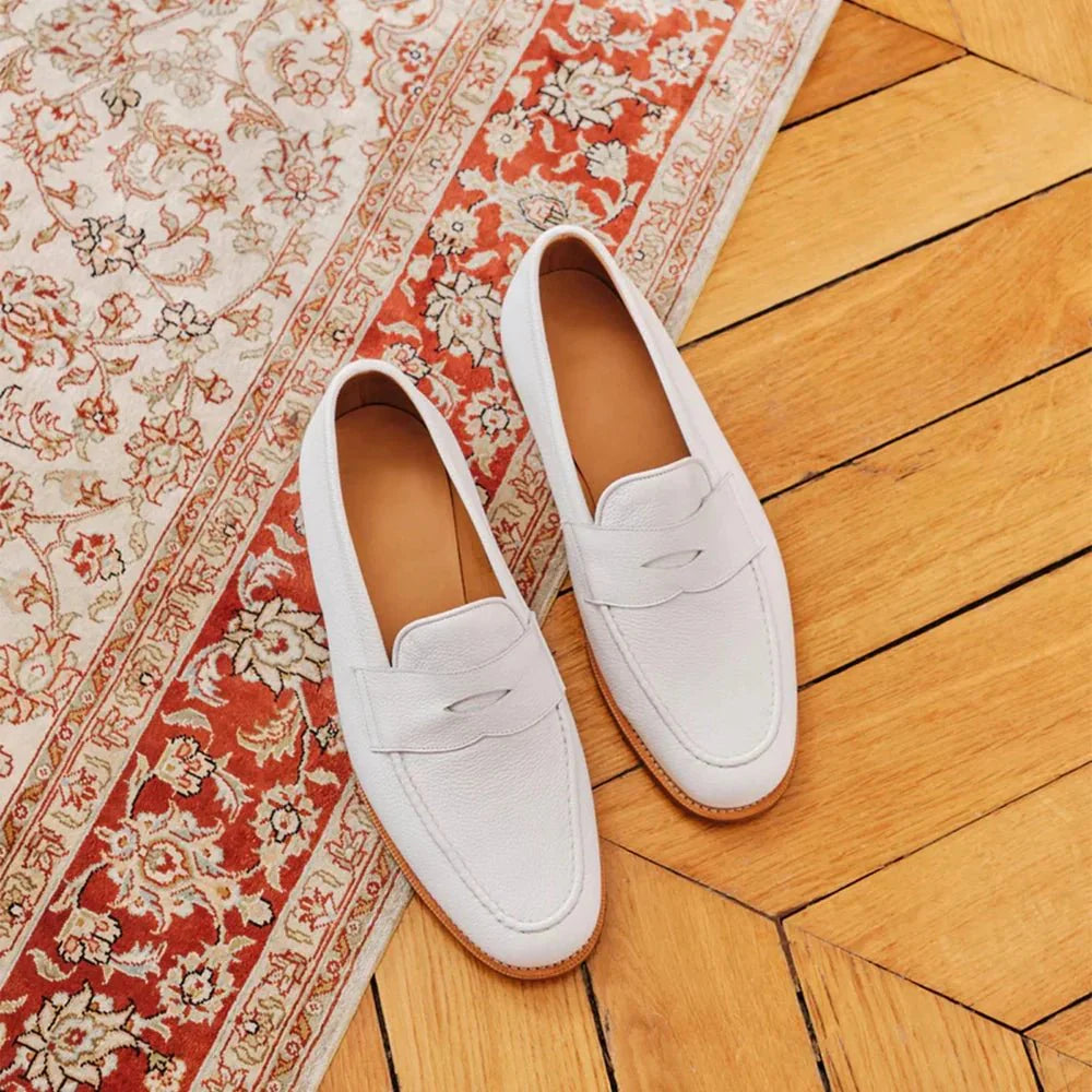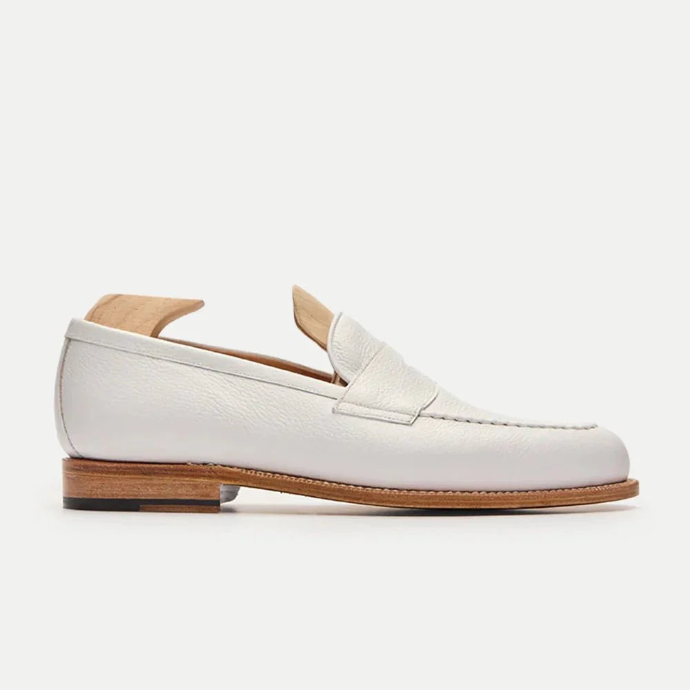 These leather penny mens white loafers are crafted from premium pebble grain calf leather which offers a touch of texture and timeless style. The interior is lined with soft glove leather for ultimate comfort while the flexible rubber sole ensures all day wearabilit and it’s hand stitched details add a touch of quality. Whether you’re dressing up for a summer wedding or adding a touch of coolness to your weekend look, these white penny loafers are the perfect finishing touch.