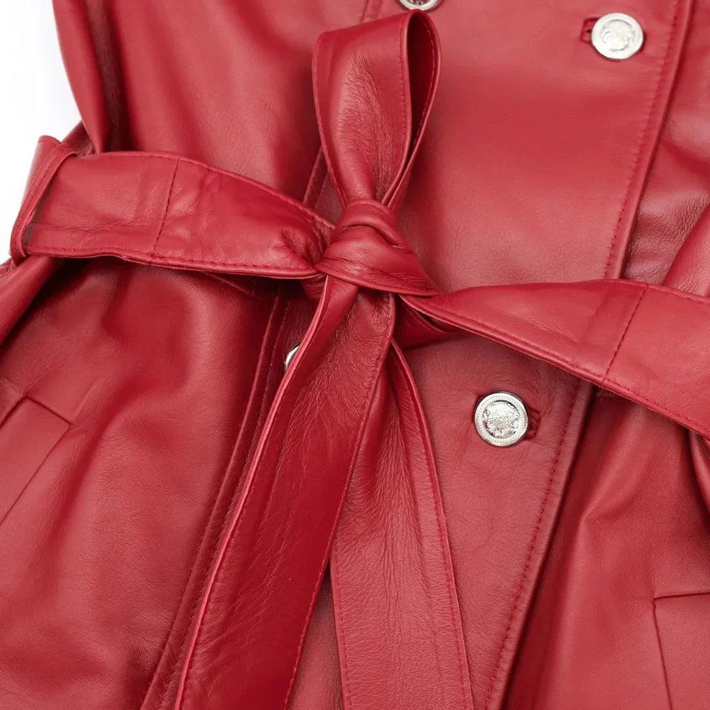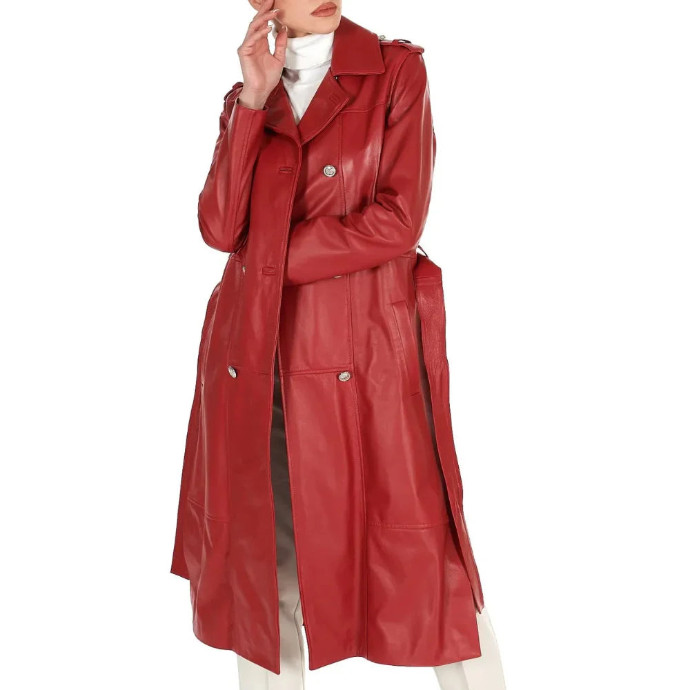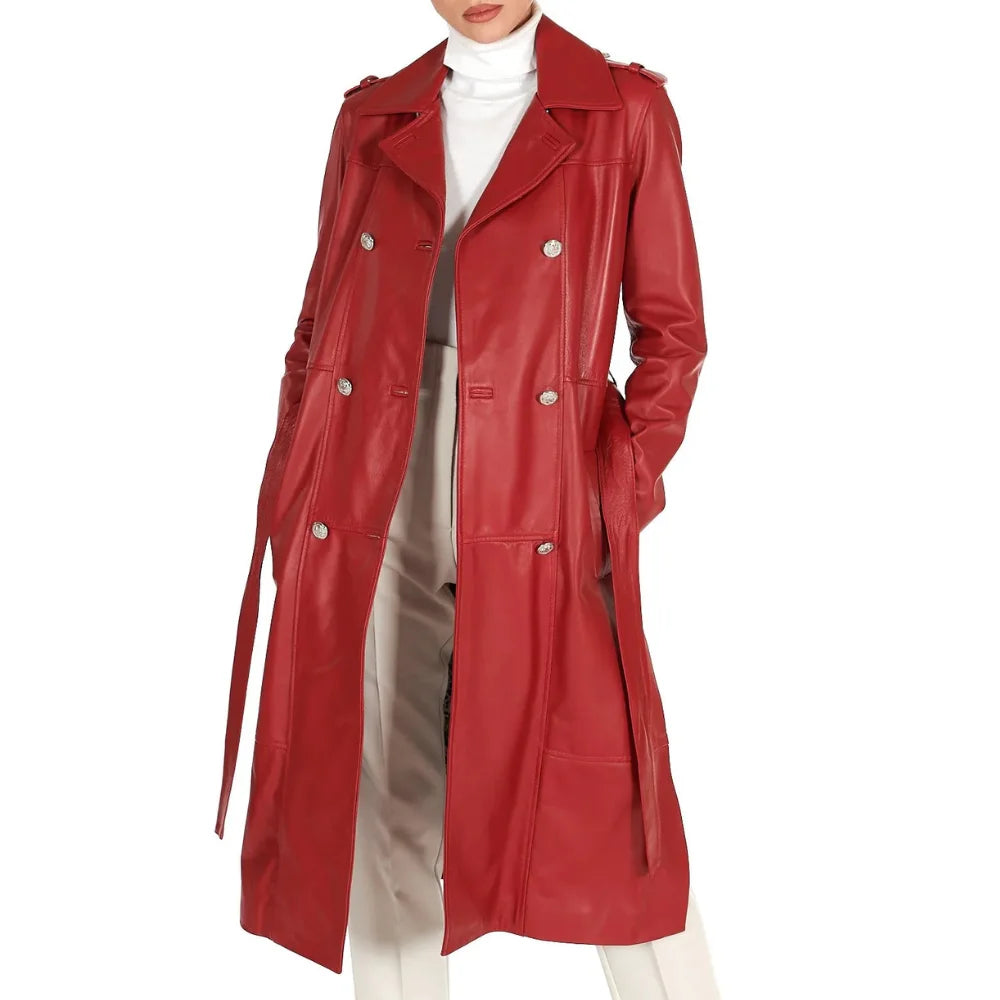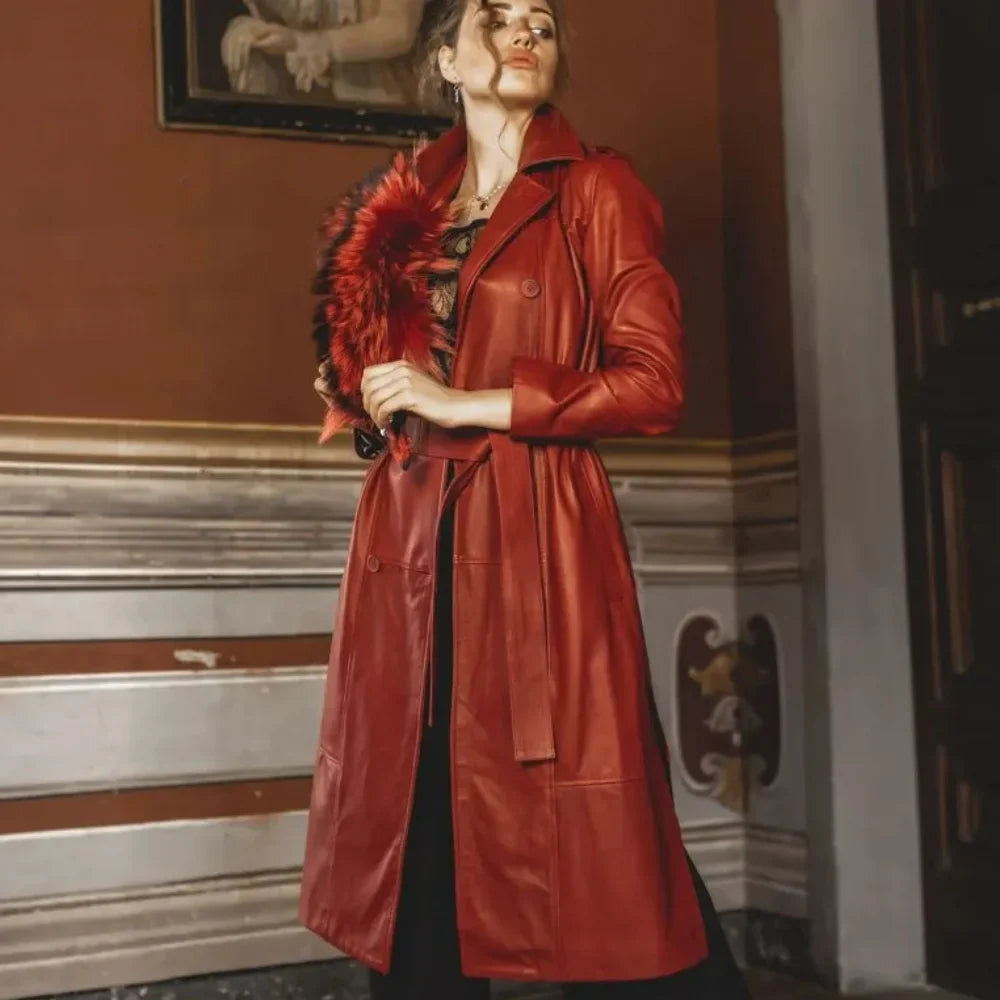 Make a bold statement with the Women’s Double-Breasted Long Leather Coat. This striking coat blends elegance with a modern look. It is made from 100% premium leather in a bright red, perfect for those who want to stand out.