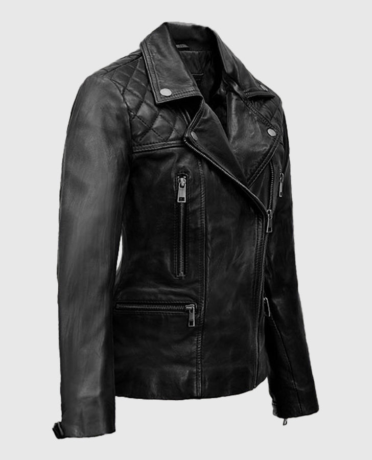 - Front: Asymmetrical Zipper Closure