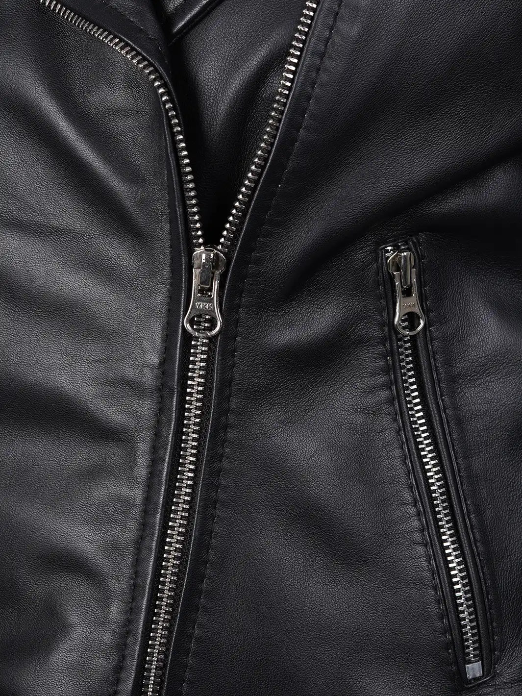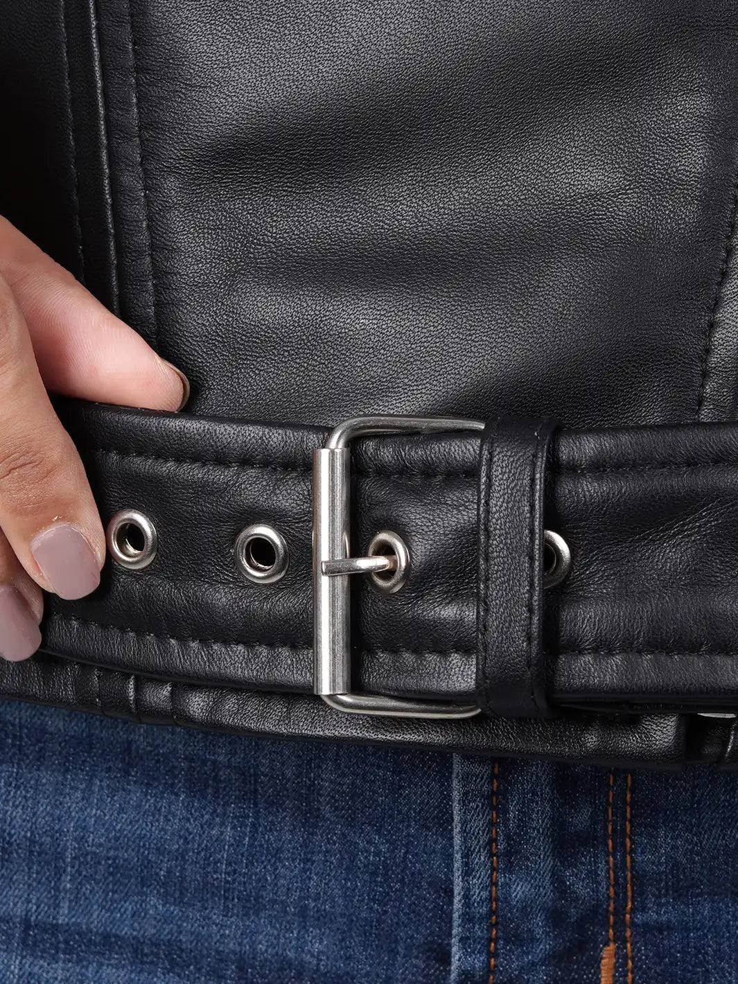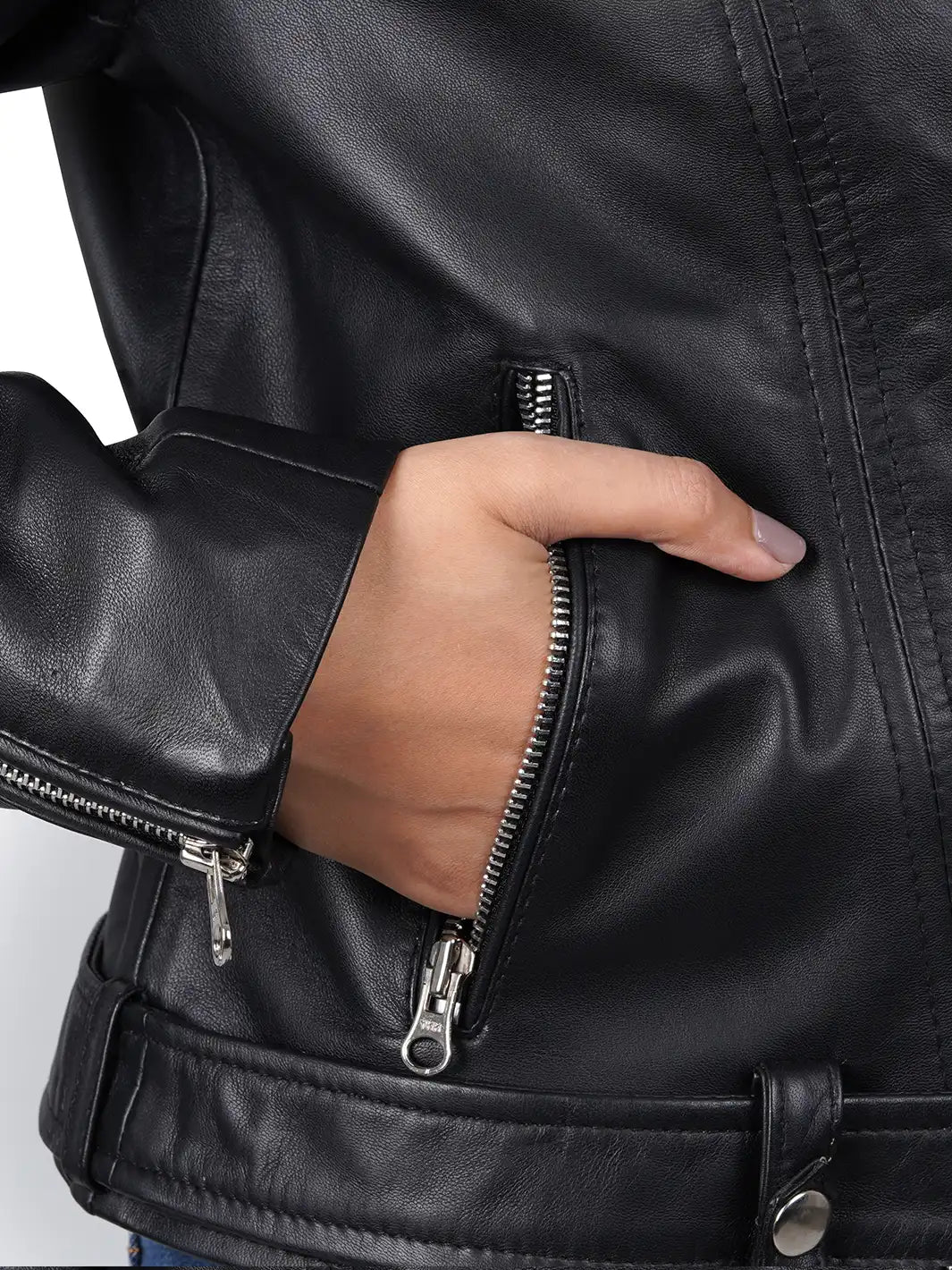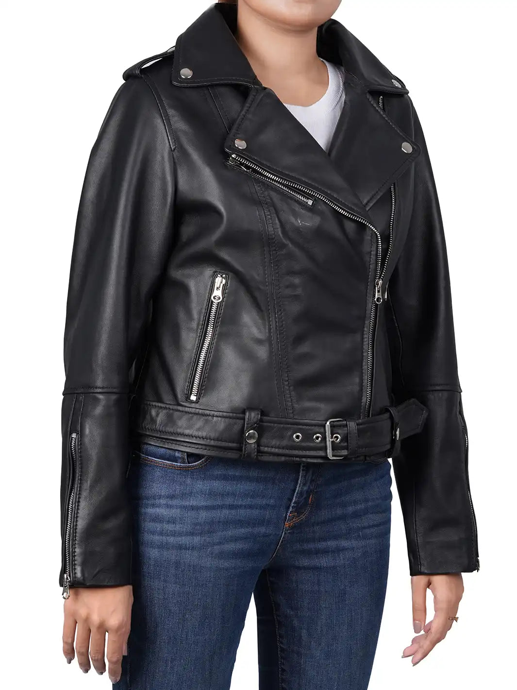 Discover our leather jacket. It features a soft polyester lining, stylish asymmetrical closure, an adjustable waist belt, and high-quality hardware and zippers. With three exterior pockets and one interior mobile pocket, this black jacket is both functional and fashionable.