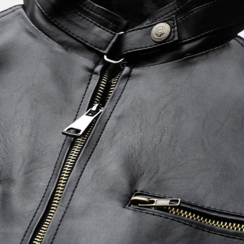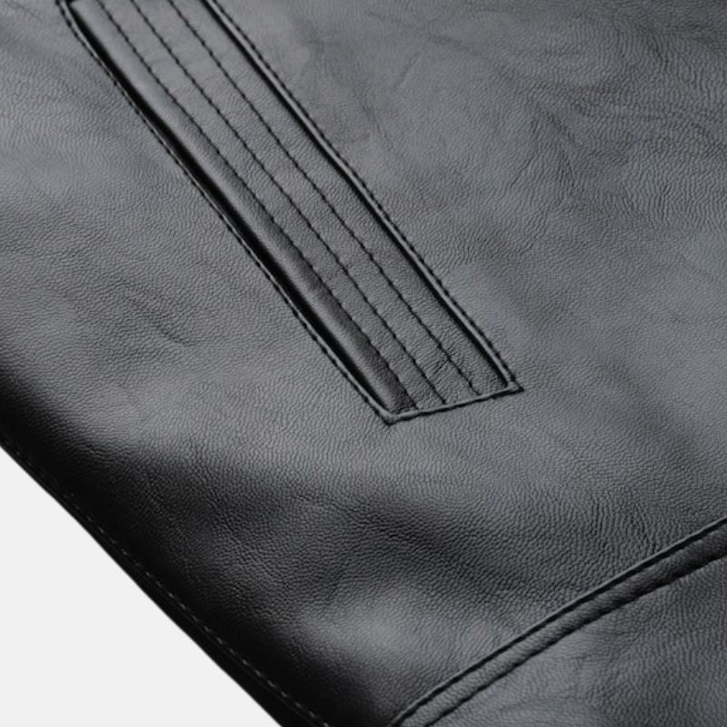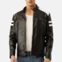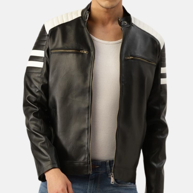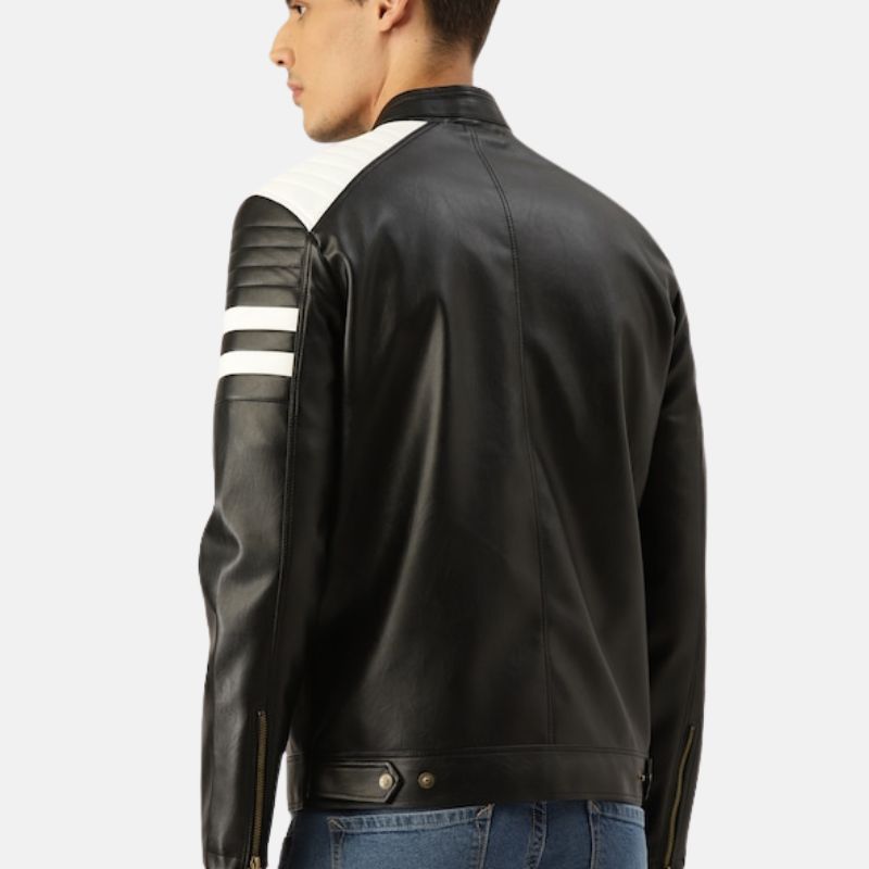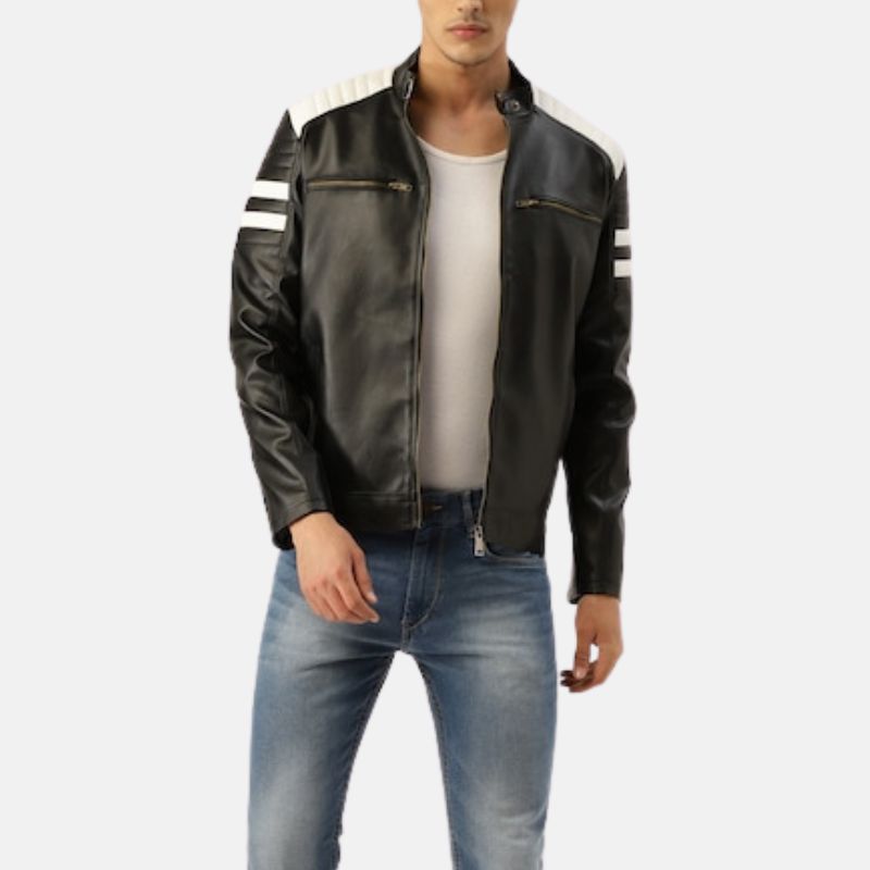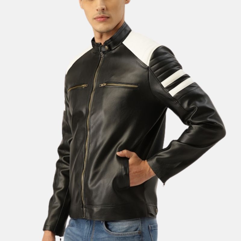 We have manufactured the same jacket with high-quality leather material. The Mayhem Project Black Jacket has a straight little collar with a button at the end. The front has a zip closure and two side pockets are also enclosed with zips. The cuffs also have vertical zips and white leather peep when they are open. Patches of white leather on the shoulders and strips on the upper half of the sleeves, give it a unique look. You can get it in genuine leather and faux leather, whatever you prefer.