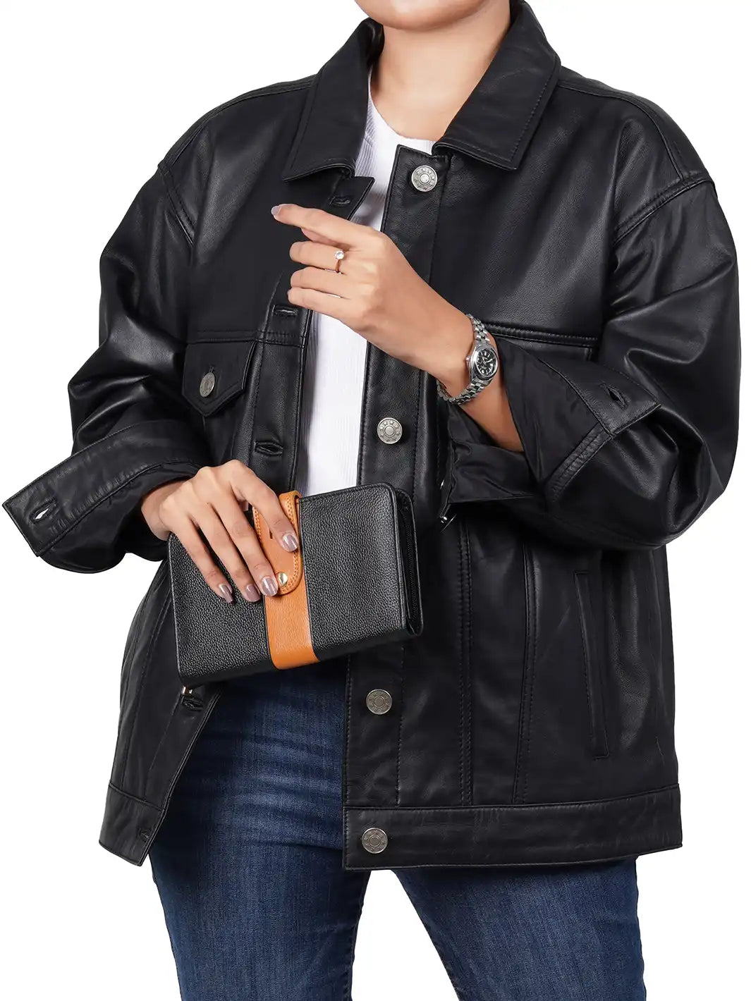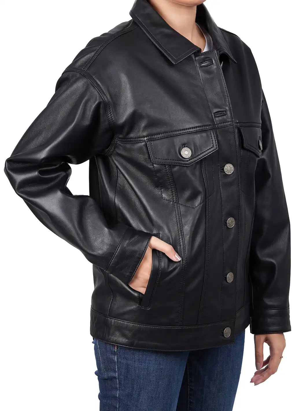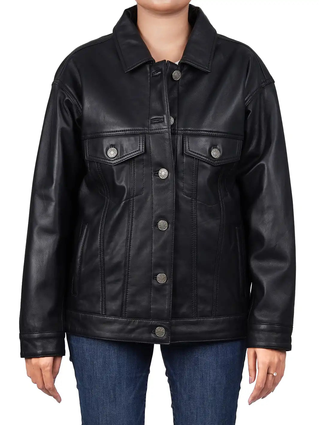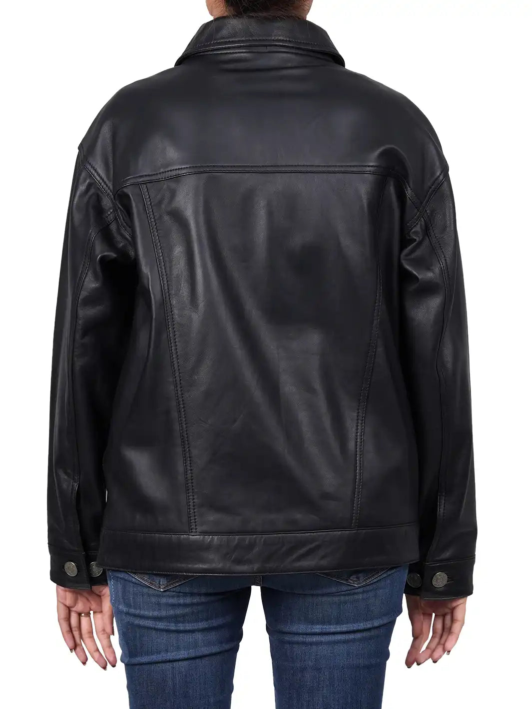 Be the first to review “Medeleine Oversized Black Leather Trucker Jacket” Cancel reply