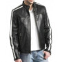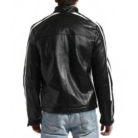 White Striped Black Cafe Racer Leather Jacket For Mens