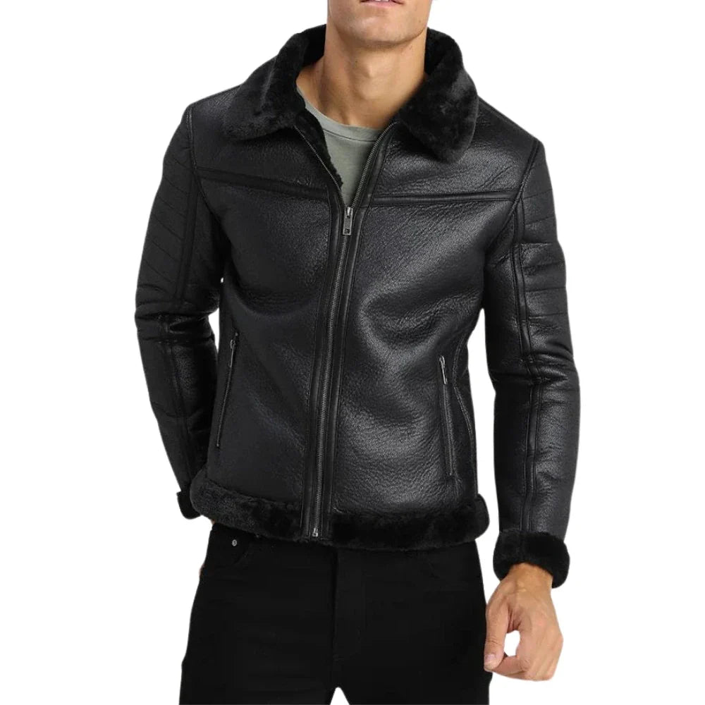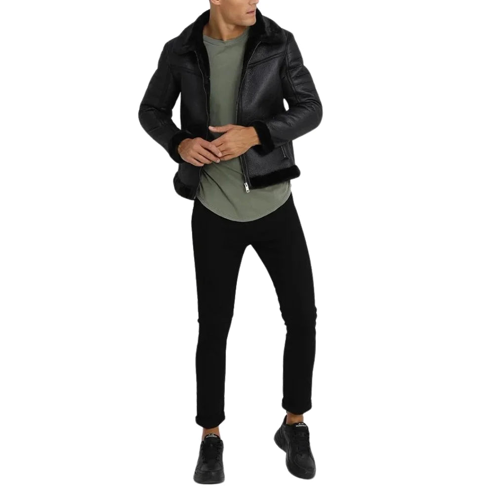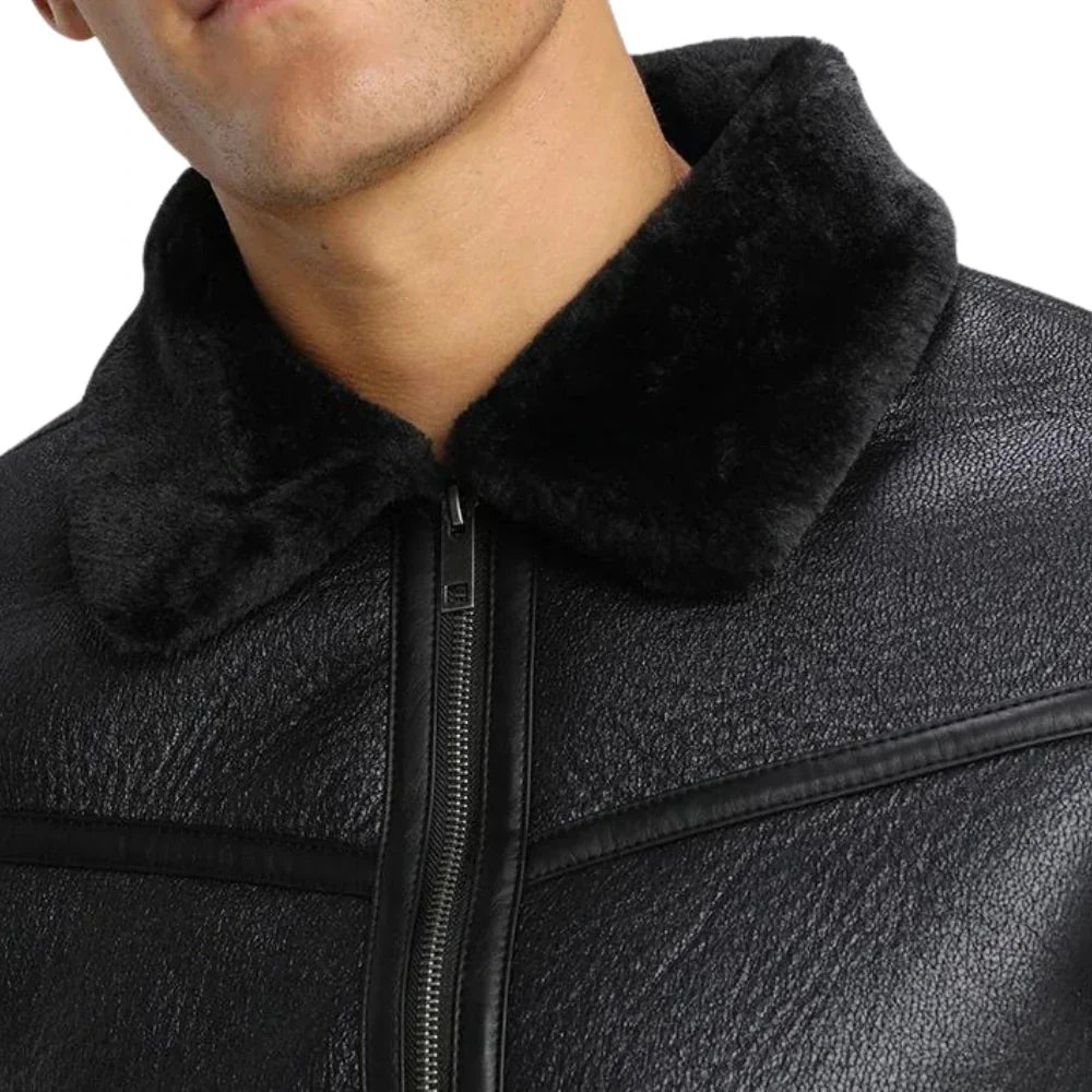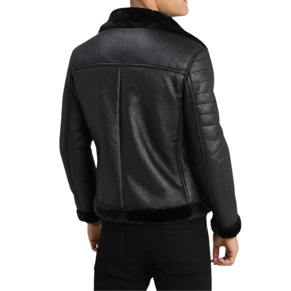 Men’s Black Lightly Padded Rugged Shearling Leather Jacket