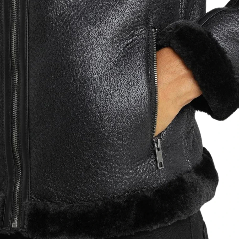 The Men’s Black Shearling Leather Jacket is a stylish and rugged choice. It is made from 100% premium leather and has a soft viscose lining for comfort. Light padding keeps you warm, and the jacket features a luxurious shearling collar, cuffs, and hem. The front zipper allows for easy wear, and there are two side zippered pockets along with one inner pocket for storage. This jacket balances timeless style with modern functionality, making it an essential part of your outerwear collection.