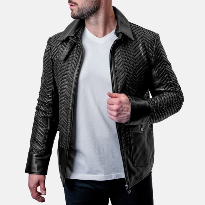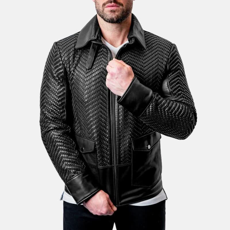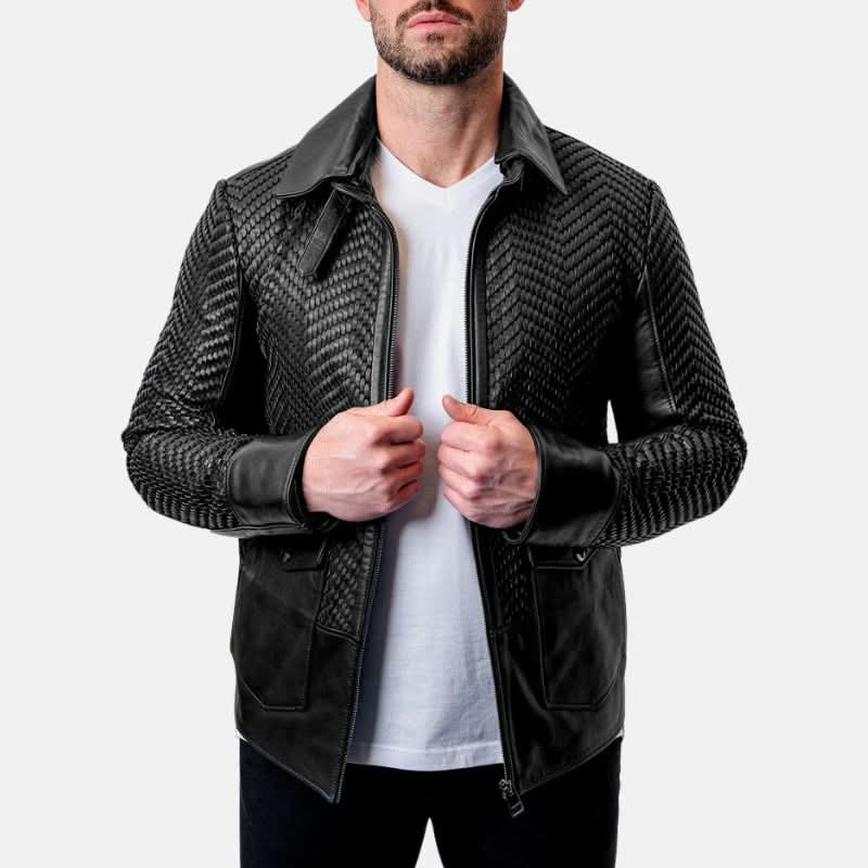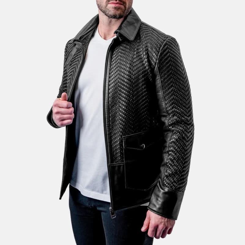 Introducing our men’s black snakeskin textured leather jacket which is crafted from 100% premium leather with a soft viscose inner, this jacket guarantees both comfort & durability. The snake print texture detailing adds a bold & distinctive touch. The wide shirt collar & zip closure provide a sleek look, while the flap pockets offer practicality. Perfect for a night out or casual gatherings, style it with jeans for an edgy, urban vibe.