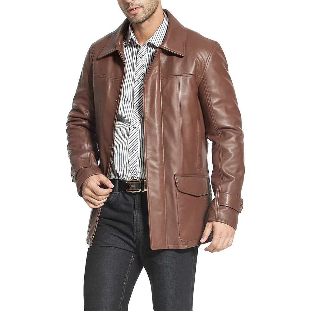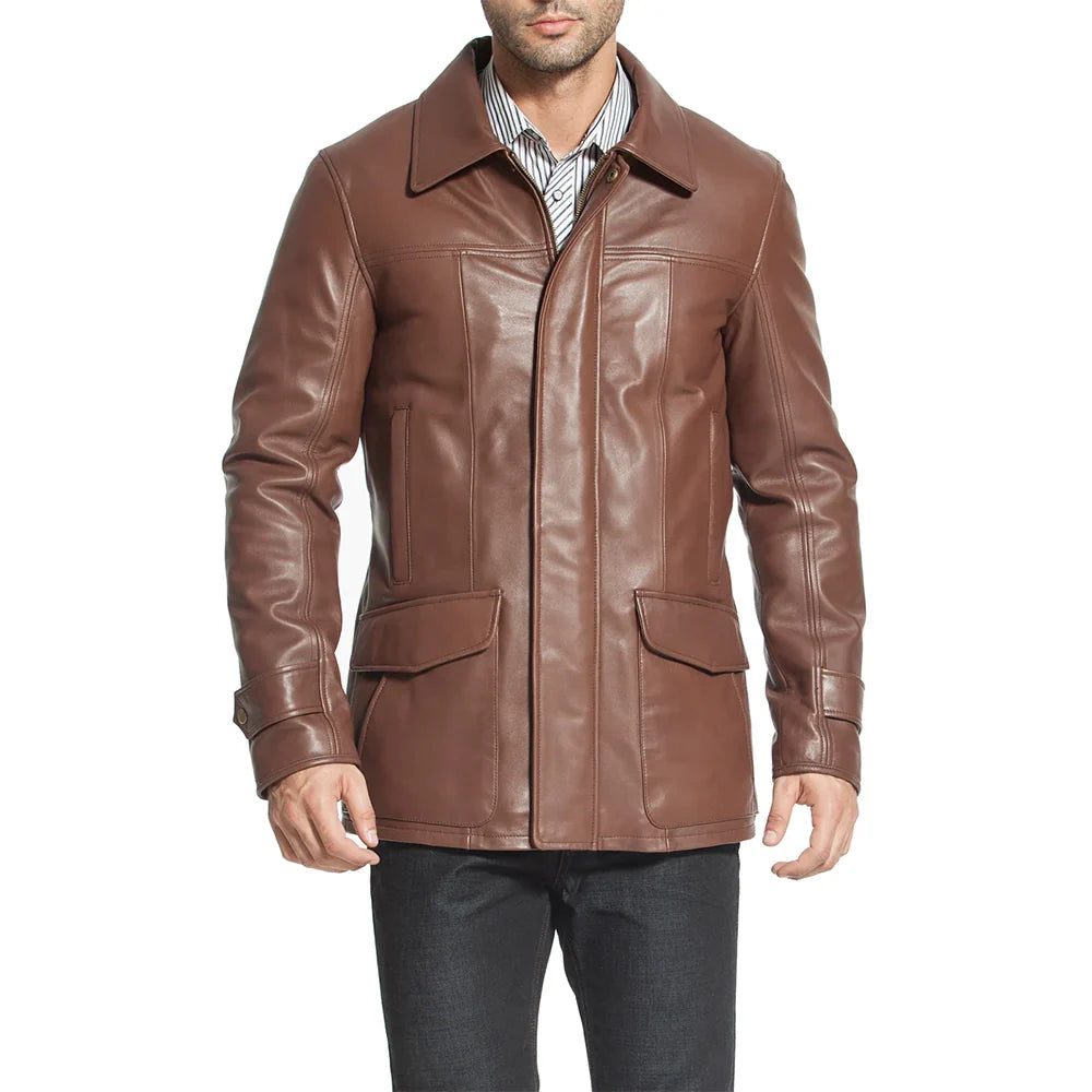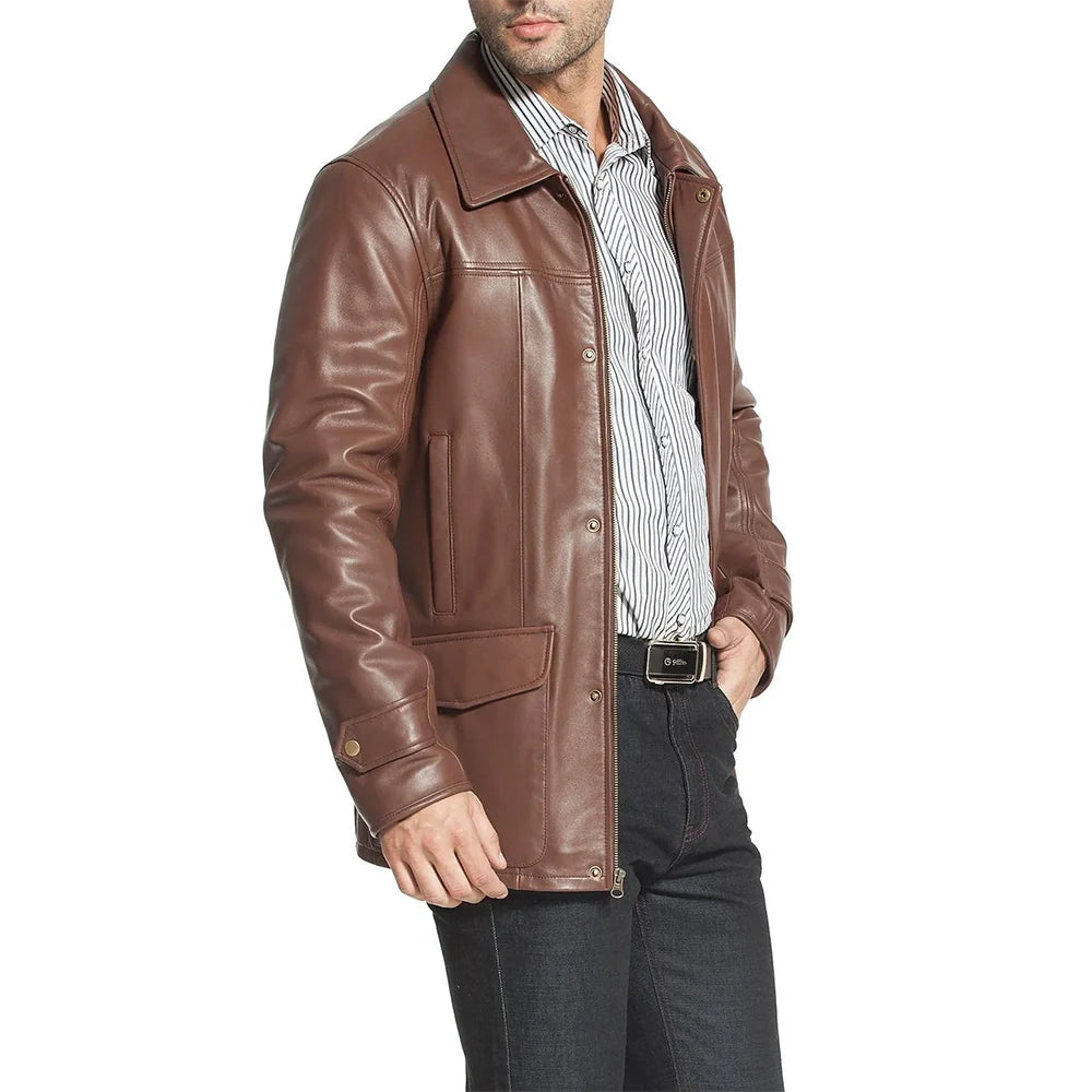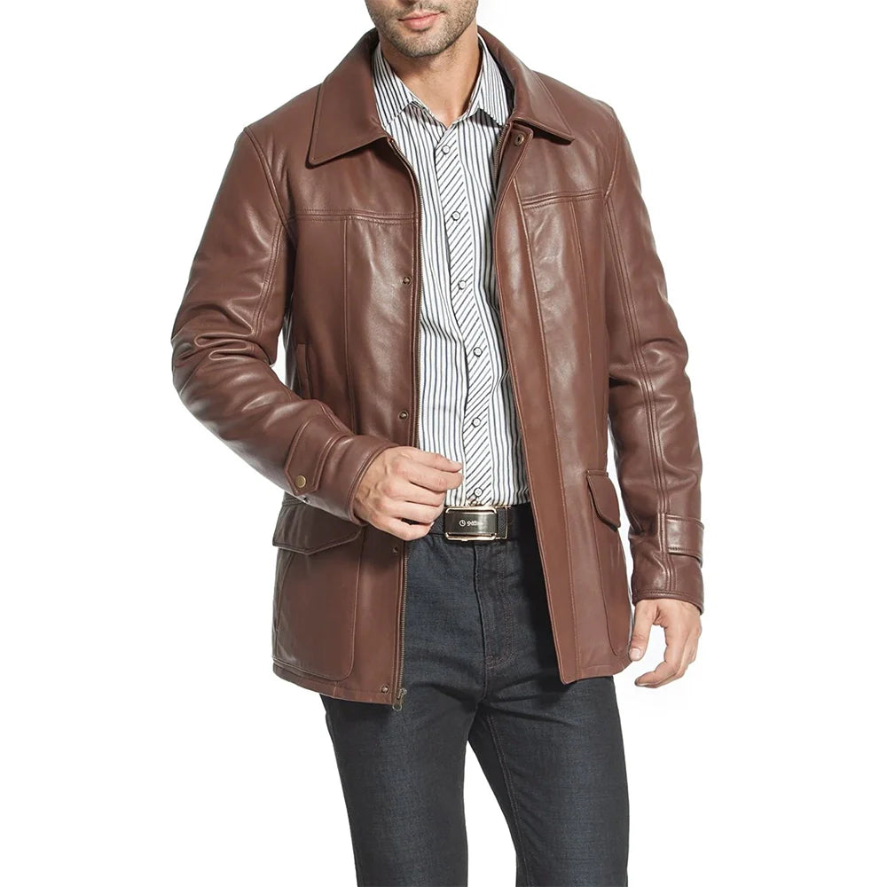 Meet our Mens Brown Bristol Real Leather Car Coat – a timeless essential for any guy’s wardrobe. Crafted from 100% premium leather in a handsome brown shade, it’s both stylish and durable. With its shirt-style collar and long length, it adds a touch of sophistication to any outfit. Pair it with jeans & a sweater for a casual yet put-together look, or layer it over a suit for a more formal occasion. This car coat is perfect for transitional seasons like fall & spring when you need an extra layer to stay warm without sacrificing style. Plus, its multiple pockets provide convenient storage for your essentials while on the go.