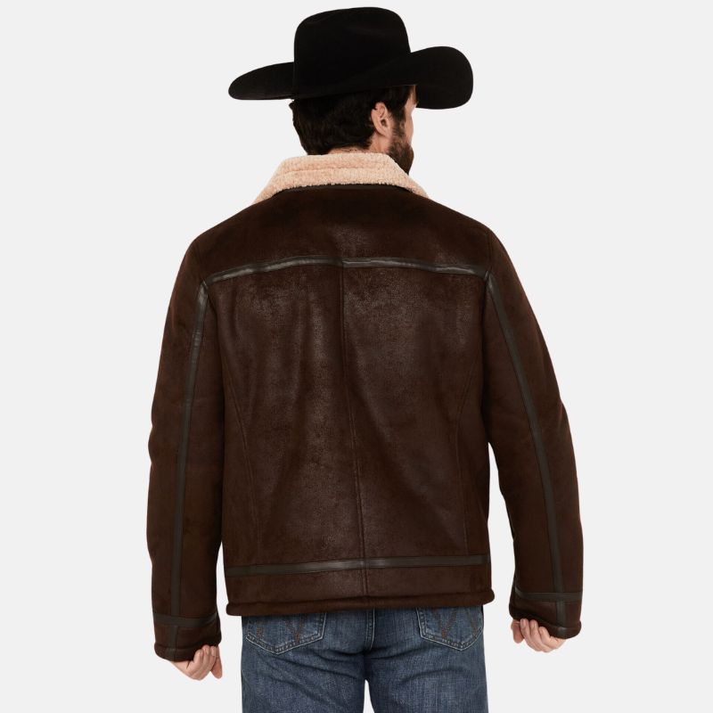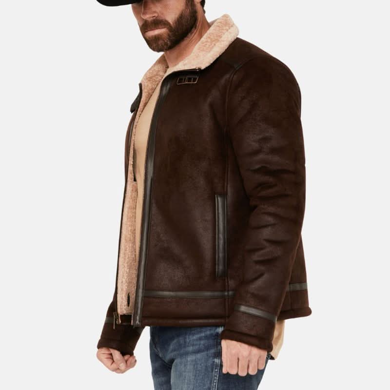 See our Men’s Brown Shearling Sherpa Lined Leather Jacket with a cozy Sherpa collar & cuff lining. Crafted from luxurious suede leather, this jacket ensures warmth & comfort. With two front pockets & an inner pocket, it’s as practical as stylish. The full zipper closure & sherpa lining at the waist provide a snug fit, making it perfect for cooler days. Elevate your fashion game with this elegant yet functional jacket – a must-have for your wardrobe.