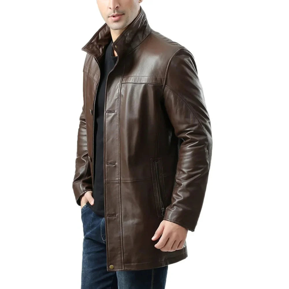 Step out in style with this stunning Men’s Lambskin Chocolate Brown Leather Car Coat. Crafted from 100% premium leather, it boasts a luxurious viscose inner lining for unparalleled comfort. The leather car coat features a unique 3/4 length, exuding a distinct and dashing look. It seamlessly combines style with functionality with open hem cuffs and a classic front button closure. Keep your essentials close at hand with two convenient side pockets and an additional inner pocket. This chocolate coat epitomizes luxury and practicality, making it perfect for any occasion.