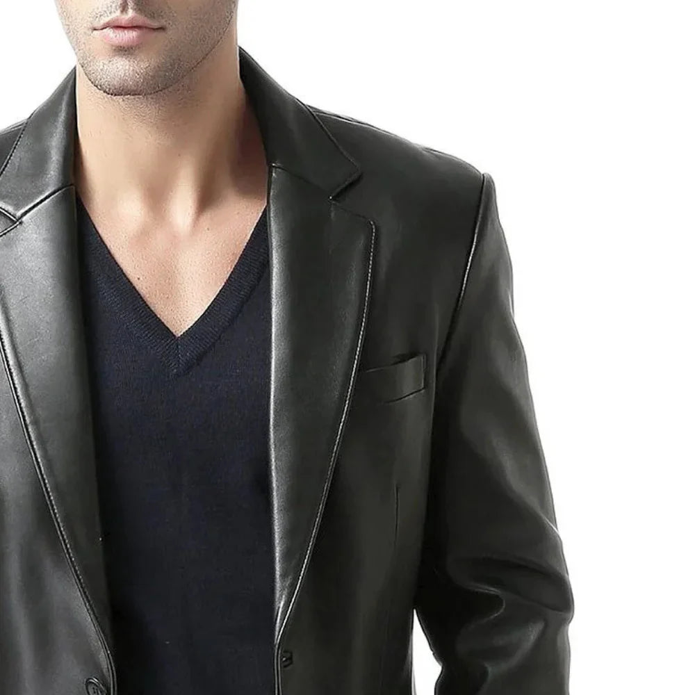 Upgrade your style with our Classic Black Leather Blazer, made from 100% natural lambskin for a sleek, sophisticated look. It has a two-button closure and a refined notch lapel collar, perfect for adding a polished touch to any outfit. With three exterior pockets, two interior pockets, and an extra mobile pocket, this blazer effortlessly balances fashion and functionality. Plus, the soft polyester lining ensures you stay comfortable all day long. Whether heading to the office or out for a night in town, this versatile jacket covers you!