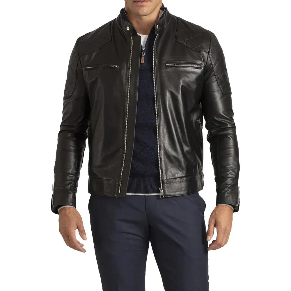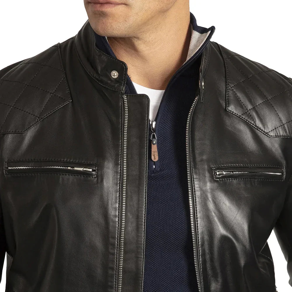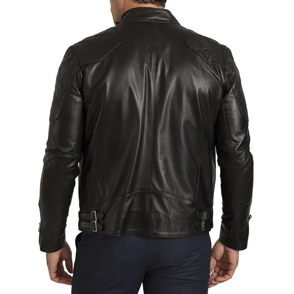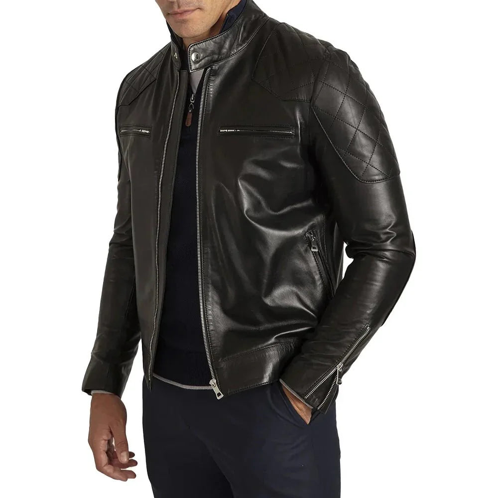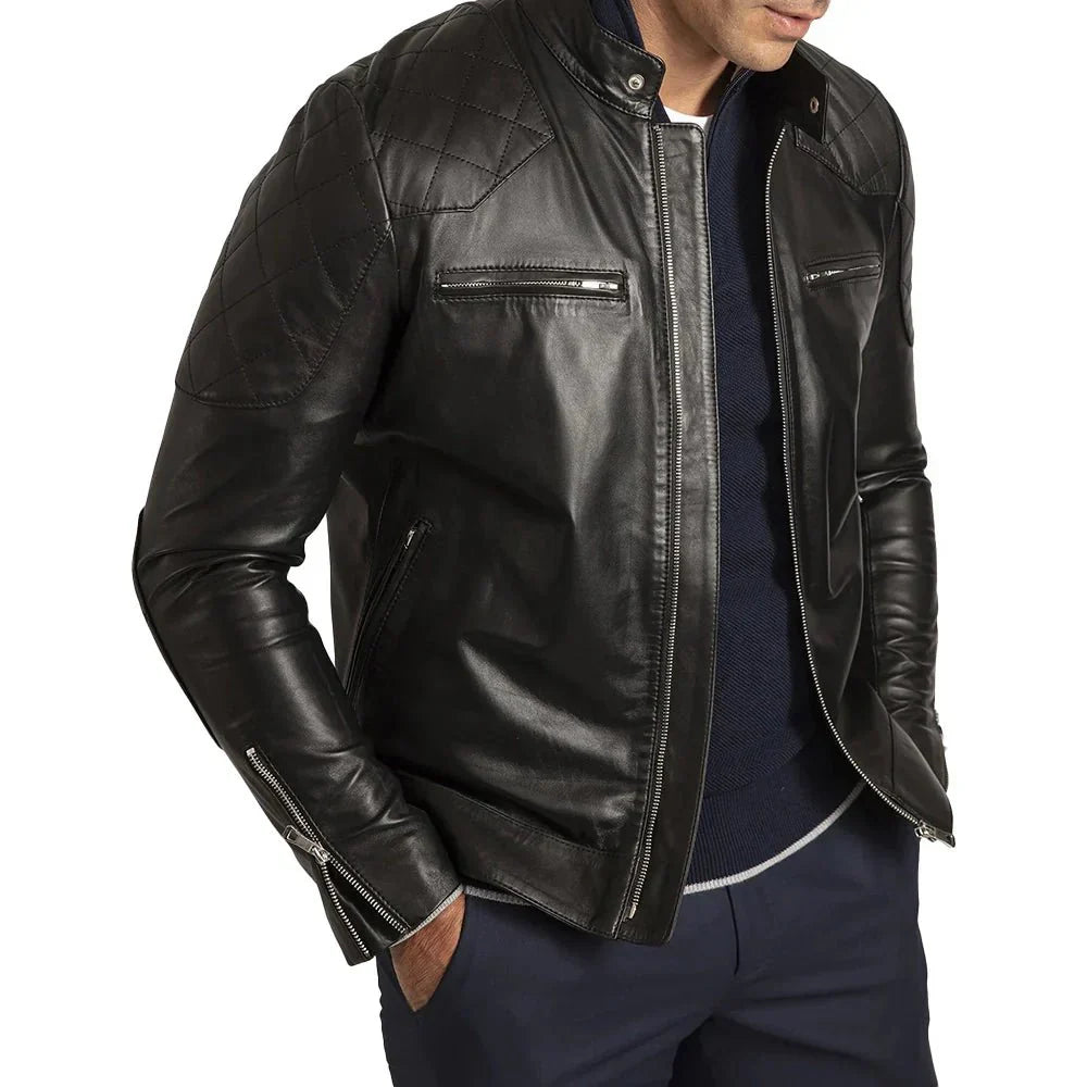 Get ready to release your inner road warrior with the David Men Diamond Quilted Black Leather Biker Jacket. Made of 100% premium leather, the black biker jacket strikes a perfect balance between statement piece and timeless staple – a must have for the modern man. This jacket for men possesses a refined biker vibe, highlighted with striking diamond quilted shoulders. Along with giving the edgy look that it has, the front zipper closure and smoothing zipper cuffs also gives secure fitting and soft feel. That viscose material is quilted and it lines the inside of the shorts to provide warmth and luxury, ideal for a chillier ride or casual outing.