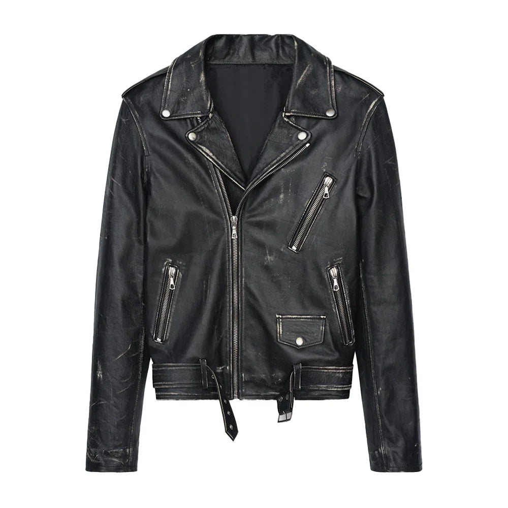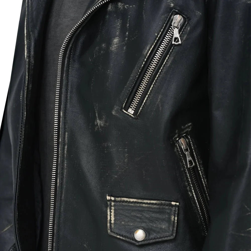 Introducing the Men’s Distressed Black Leather Biker Jacket, a rugged yet stylish addition to any wardrobe. Crafted from 100% premium leather, it boasts a soft viscose inner lining for comfort. With its iconic biker style & asymmetrical zipper closure, this jacket exudes effortless cool. Zipper cuffs & multiple pockets add practicality to its design. Pair it with jeans & boots for a classic biker look, perfect for casual outings or rides on your motorcycle. Whether you’re hitting the road or hanging out with friends, this jacket is sure to make a statement.