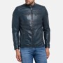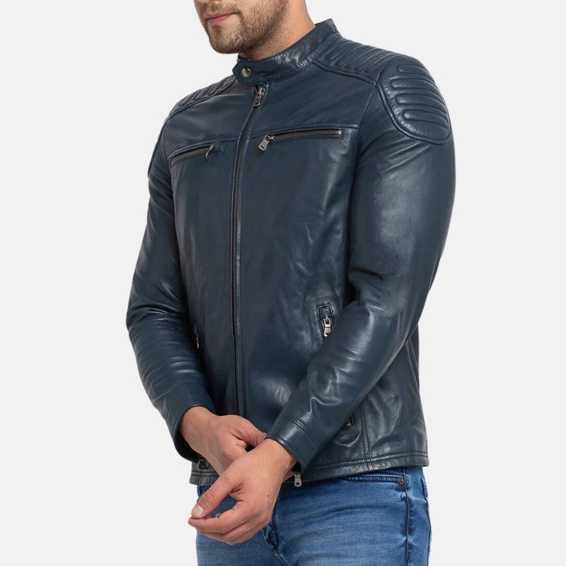 Navy Blue Cafe Racer Motorcycle Leather Jacket For Mens