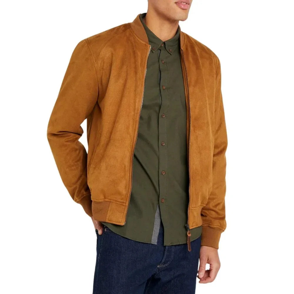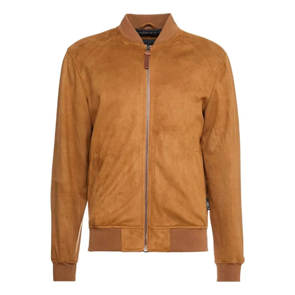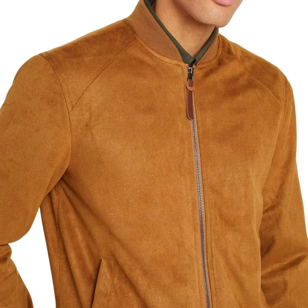 The Men’s Rib Knitted Men’s Suede Leather Jacket in Camel Brown Color. It brings together high-end craftsmanship and contemporary design. Made from 100% Premium Suede leather, this men’s brown suede jacket is soft to the touch, while the polyester lining ensures long-lasting comfort. The rib-knitted collar, cuffs, and hemline give it a structured yet laid-back look. The front zipper closure offers ease and practicality, complemented by two external and two internal pockets for extra utility. Its camel brown shade is rich and stylish, making this jacket an excellent addition to your wardrobe for both casual and elevated occasions.