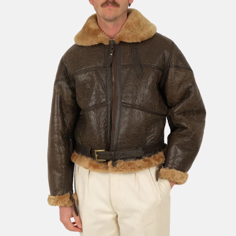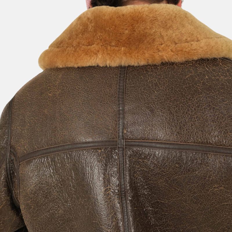 Distressed Brown Shearling Leather Bomber Jacket For Mens