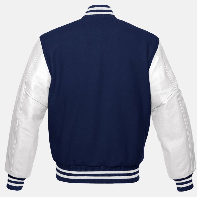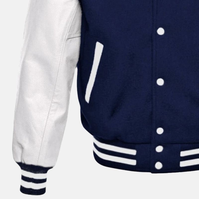 Navy Blue Wool Varsity Jacket With White Leather Sleeves For Mens
