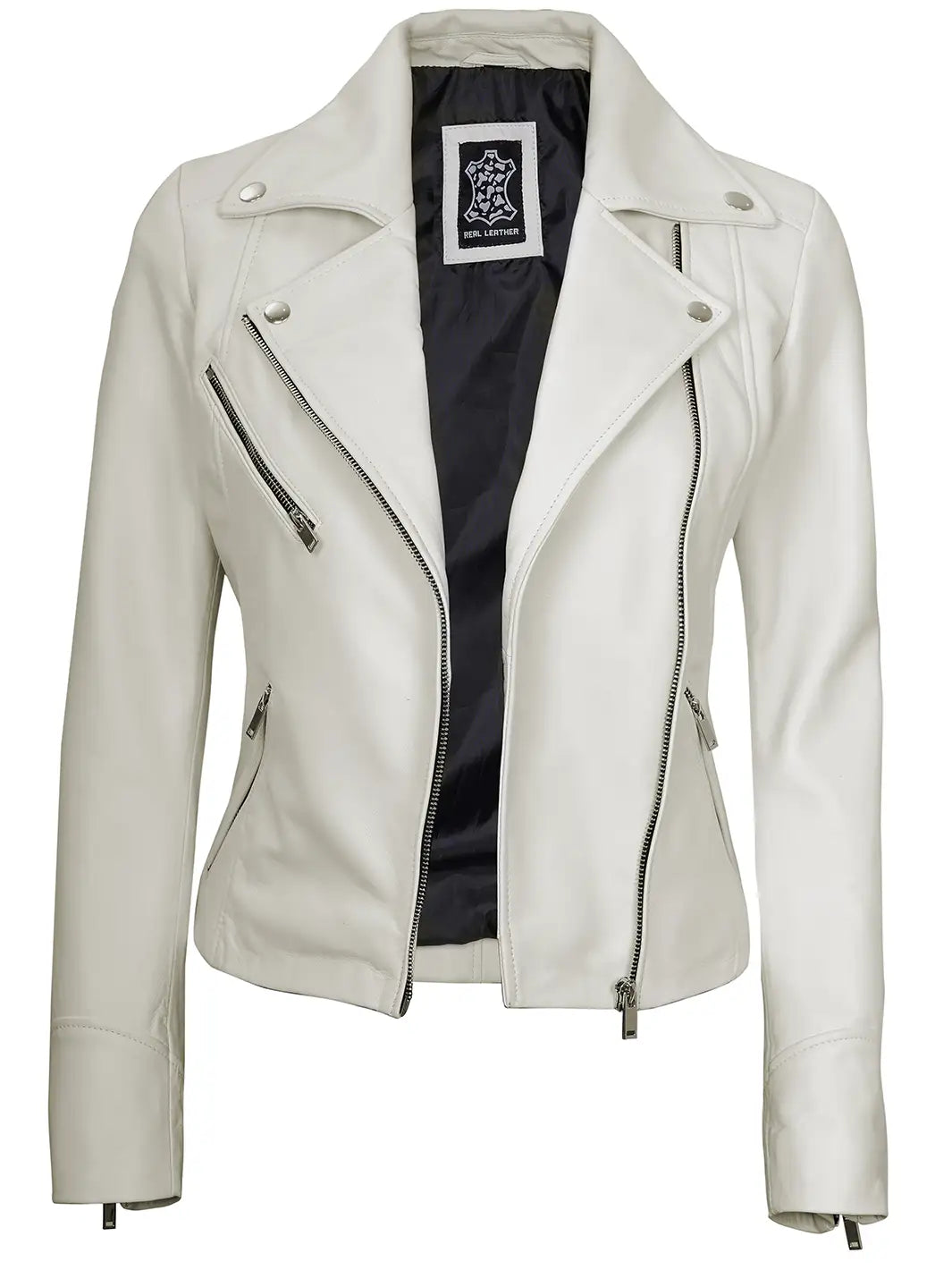 Introducing the Ninfa Women’s White Asymmetrical Biker Leather Jacket – a masterpiece that perfectly embodies a harmonious blend of timeless charm and modern flair, designed for the woman who dares to stand out.