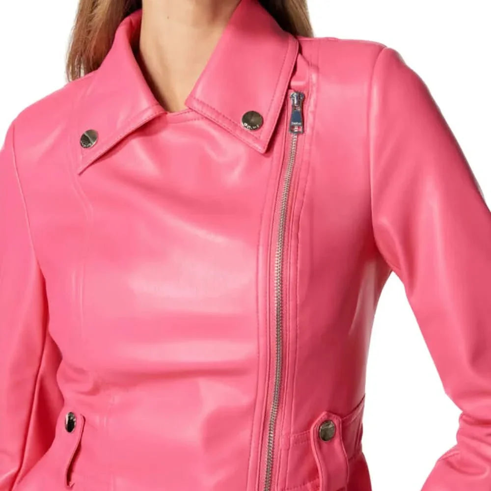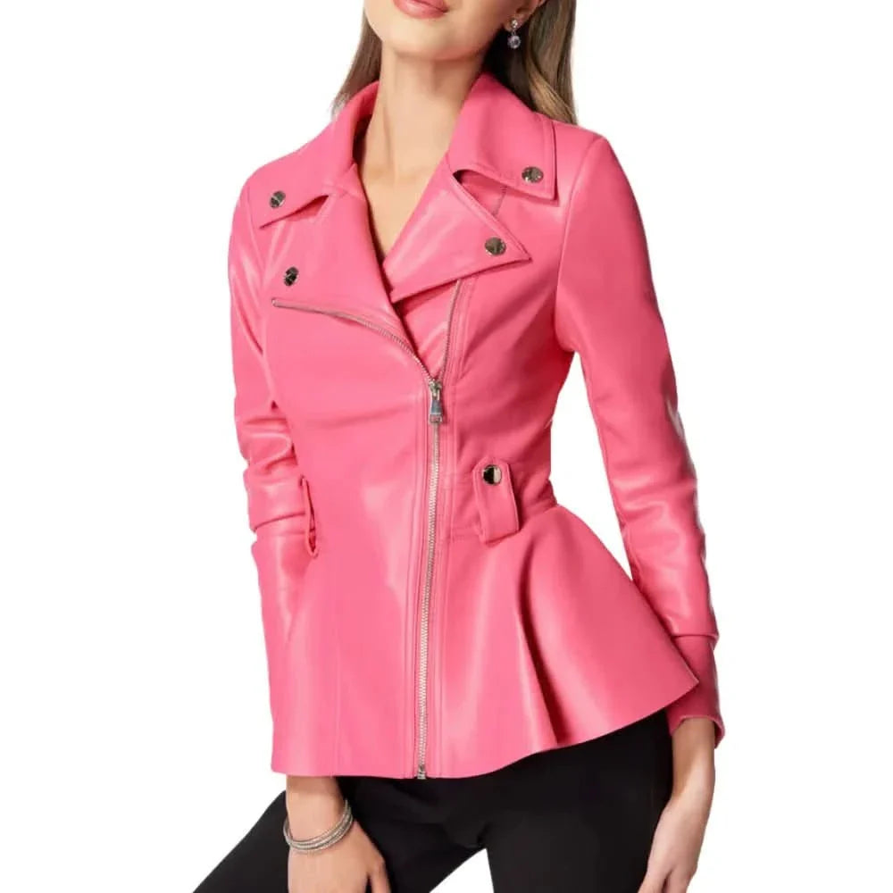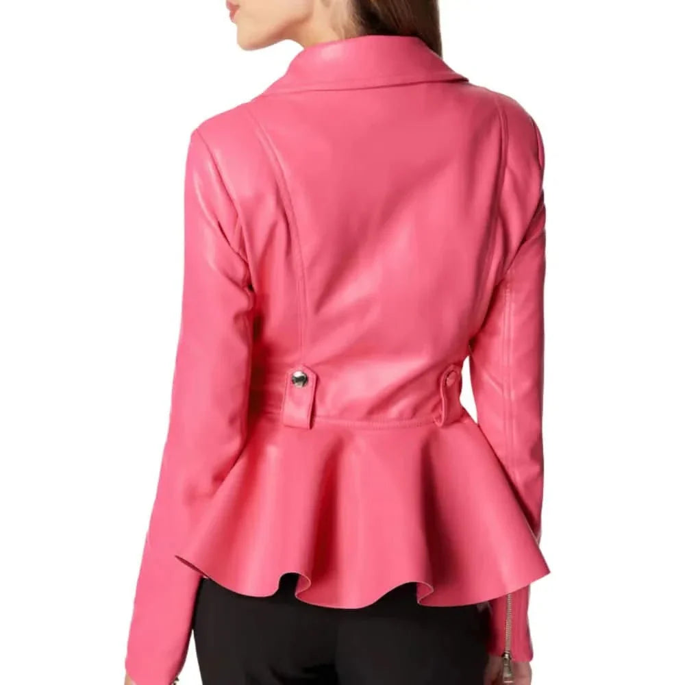 Step out in style with this stunning Women’s Pink Peplum Leather Jacket. Crafted from 100% real lambskin leather, it feels luxurious & looks chic. The peplum design adds a touch of flair, making it stand out from the usual jackets. Featuring an asymmetrical zipper closure & zipper cuffs, it exudes a modern vibe. Stay cozy with its soft viscose inner lining. Plus, it’s practical too, with three outer pockets & an inner pocket for your essentials. This jacket is a perfect blend of fashion & functionality for any occasion.
