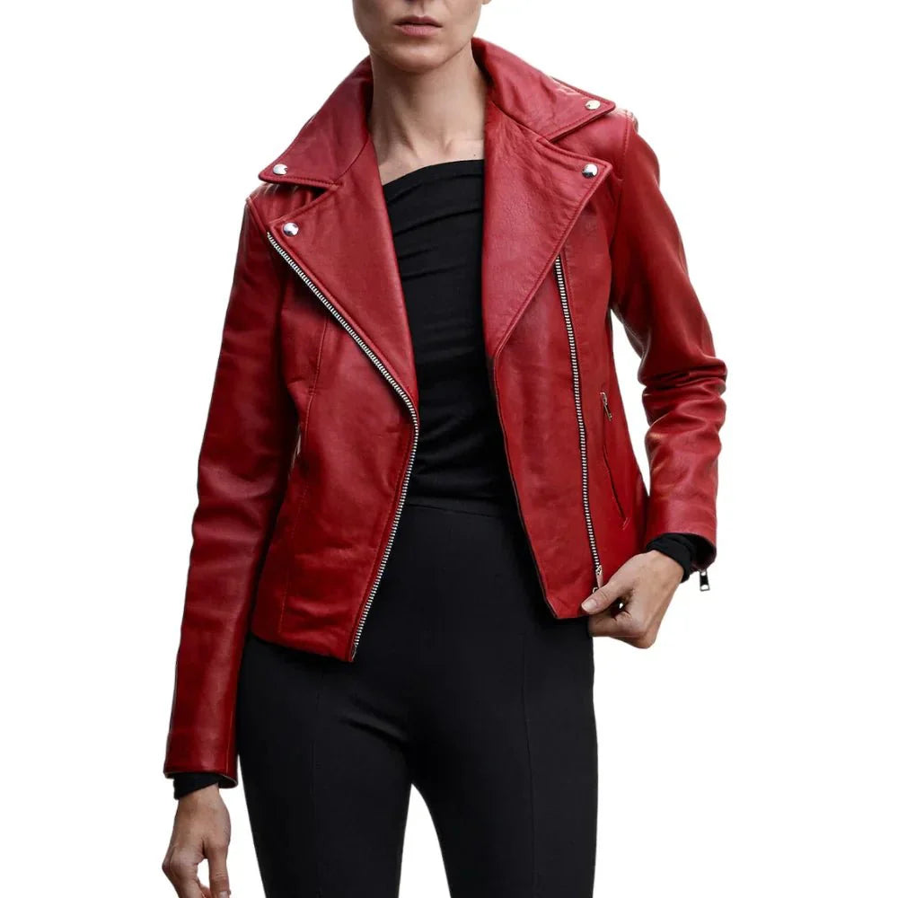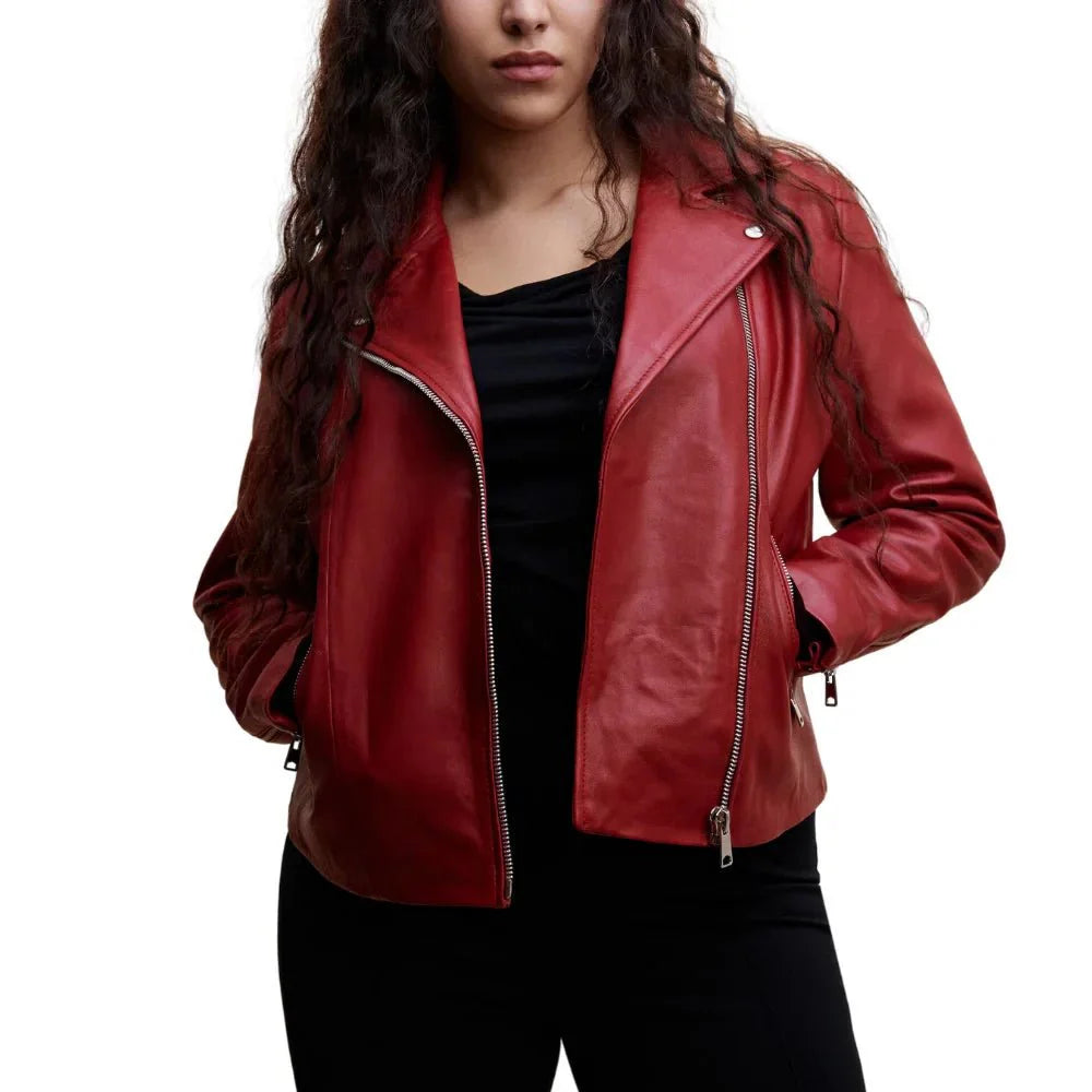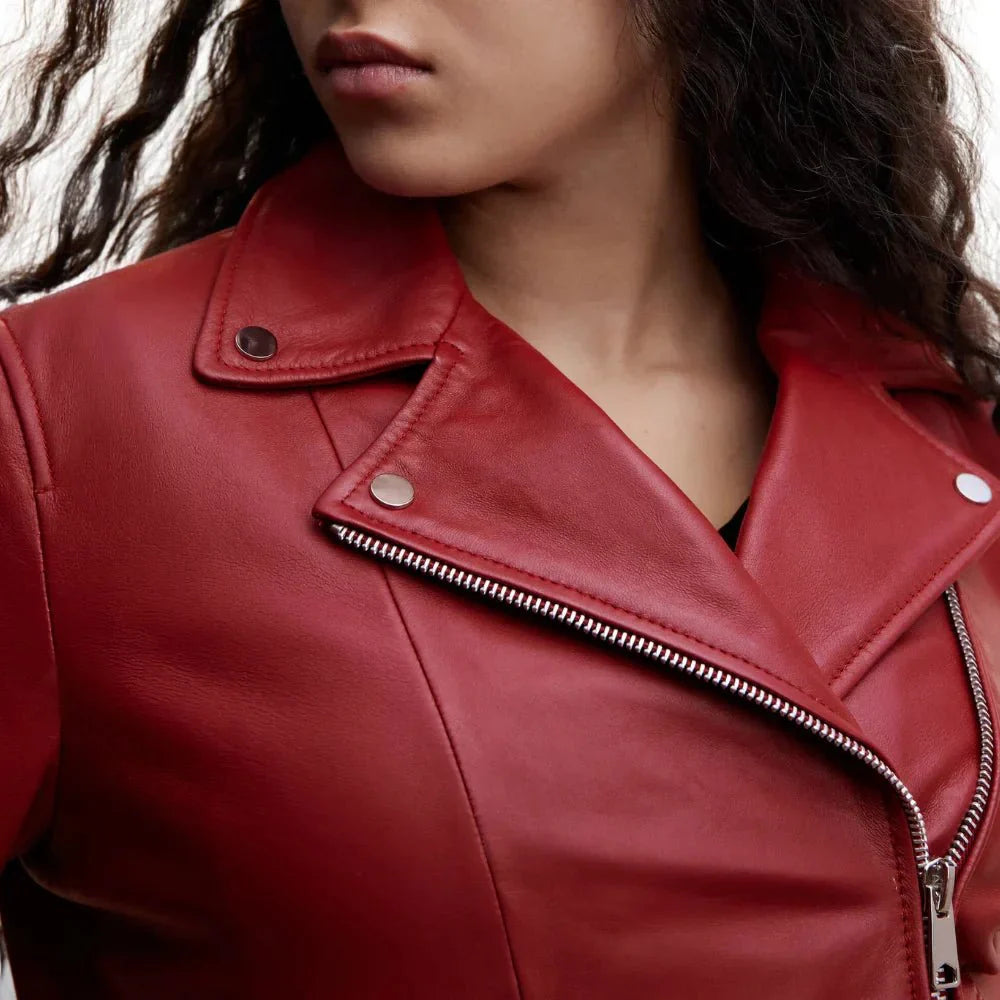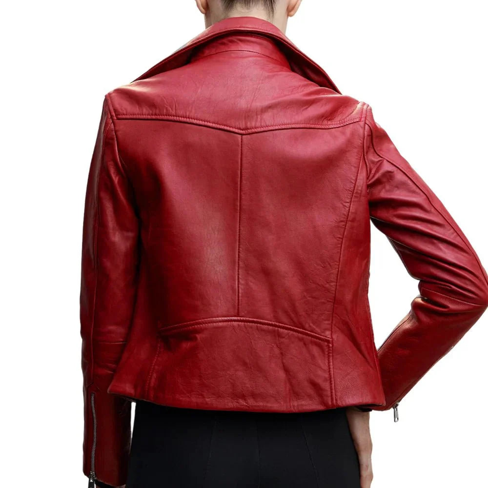 Are you looking to make a statement and stand out in the crowd? Wear the exotic Alyssa Diaz Red Biker Leather Jacket today! Featuring a perfect moto design made from premium leather with buttery soft touch, this jacket gives the perfect blend of attitude and style. Take the asymmetrical zipper closure and the notched lapel and pair it with the relaxed bodice that features zippered pockets, because it’s both very comfortable and practical. Rockstar-inspired touches of zippered cuffs and shoulder epaulets introduce a playful and rebellious note. The sleek black motorcycle jacket can be considered the epitome of fashionable confidence for anyone looking for a staple piece in their wardrobe.