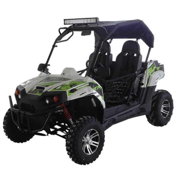 Explore the Great Outdoors with the TrailMaster Challenger 200X Deluxe UTV! It’s designed to be just the right size for many age groups with an adjustable steering column and reverse! Plus, there’s a full upper brush guard complete with sunshade canopy for all day riding, side protection rails with heavy-duty nylon safety nets and dual seats with seat harnesses to help keep you safe while riding. The TrailMaster Challenger 200X UTV is powered by a reliable, electric start 4-stroke engine, automatic CVT transmission and chain driven dual rear wheel drive. Stopping is extra firm thanks to 4-wheel hydraulic assist disc brakes. The full suspension system and all-terrain tires help the Challenger 200X crawl over the toughest trails. The Challenger 200X UTV comes in several great colors!