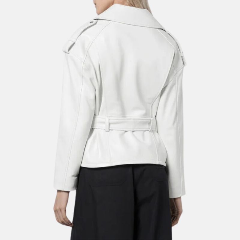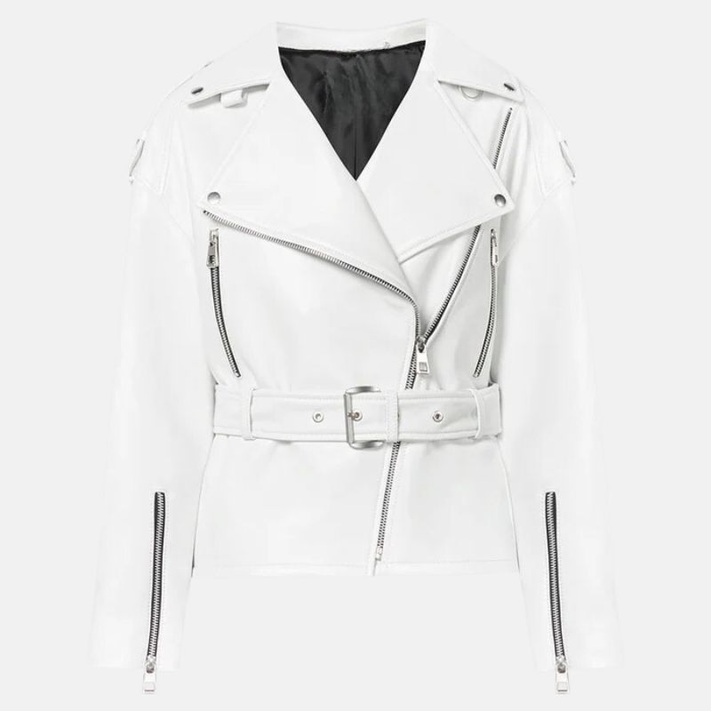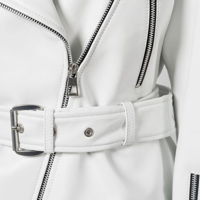 This biker white leather jacket womens is totally edgy and cool. It’s made from premium leather and has a comfy viscose inner lining. This white leather biker jacket womens has a cool asymmetrical zipper and a stylish lapel collar. It comes with a belt so you can cinch it at the waist. You’ll love the zippered pockets, two on the outside and one inside.